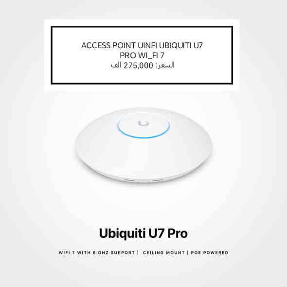 .... بسم الله الرحمن الرحيم.... السلام عليكم تتوفر لدينا جميع انواع الرواترات السقفية والخارجية من ماركة #UBIQUITI بكميات كبيرة وعروض خاصه لأصحاب المكاتب 👏❤️ عرض اليوم على الجيل السابع WI_FI 7 / Uinfi Ubiquiti U7 PRO WI_FI 7 /🟢🟣 السعر: 275,000 الف مواصفات الجهاز : 🔵 التقنية العامة الجيل: Wi-Fi 7 (802.11be) النظام: Tri-Band — ثلاث نطاقات 2.4GHz 5GHz 6GHz ⚡ السرعة والأداء السرعة الكلية: 9.3 Gbps تقريبًا عدد الأجهزة المدعومة: 300+ جهاز عدد التيارات (Spatial Streams): 6 Streams مناسب للأماكن ذات الكثافة العالية (مكاتب، محلات، شركات) 📶 التغطية تغطية داخلية تقريبية: 140 متر مربع أداء ثابت حتى مع استخدام ثقيل (فيديوهات، مكالمات، أجهزة متعددة) 🔌 المنافذ والطاقة منفذ شبكة: 2.5GbE RJ45 نوع الطاقة: PoE+ (Power Over Ethernet) يشتغل باستخدام سويتش PoE فقط بدون محول إضافي 🔐 الأمان يدعم WPA3 إدارة كاملة عبر تطبيق UniFi Network Controller 🧩 التركيب تركيب على السقف أو الحائط شكل دائري أنيق ومخصص للاستخدام الداخلي ✅ الخلاصة جهاز U7 Pro يعتبر واحد من أقوى الأكسيزات بالسوق: سرعة عالية جدًا استقرار ممتاز دعم عدد كبير من الأجهزة تحكم سهل عبر UniFi مناسب للشركات والمنازل الكبيرة Uinfi Ubiquiti U7 outdoor WI_FI7 / 🔴🔵 السعر: 300,000 الف مواصفات الجهاز : 📡 المواصفات الأساسية معيار الواي فاي: Wi-Fi 7 (802.11be) — أحدث معيار للواي فاي بسرعات وتحسينات كبيرة. النطاقات: 2.4 GHz + 5 GHz (Dual-Band). عدد التيارات (Spatial Streams): 4 تيارات مكانية لتحسين الأداء. السرعة الكلية: حتى حوالي 4.3 Gbps عبر النطاقات. عدد الأجهزة: يدعم أكثر من 200 جهاز متصل في نفس الوقت. 🛠️ التصميم والقدرات الخارجية مقاومة الطقس: تصميم خارجية مقاوم للجو (IPX6) لتحمل المطر والحرارة والغبار. تغطية: حتى 465 م² في مساحة مفتوحة. هوائي فائق التوجيه (Super Antenna): مدمج لتغطية أطول مدى. تركيب مرن: يمكن تركيبه على الجدار أو عمود / عمود إنارة بسهولة. 🔌 المنافذ والطاقة منفذ شبكة: 1 × 2.5 GbE RJ45 لتوصيل سريع وثابت. الطاقة: تدعم PoE+ (Power over Ethernet) — نفس الكابل للطاقة والبيانات. 🔐 أمان وإدارة يدعم أمان WPA3 لحماية الشبكة من الهجمات. إدارة وتحكم كامل عبر UniFi Network Controller من الهاتف/الكمبيوتر. 🧠 الخلاصة السريعة ✅ نقطة وصول خارجي قوية ومقاومة للطبيعة ✅ Wi-Fi 7 سريع وفعّال في المساحات المفتوحة ✅ تغطية واسعة (~465 م²) ✅ دعم أكثر من 200 جهاز مع إدارة UniFi الأفضل للشبكات الكبيرة نسعى لأراضكم ونوفر جميع متتطلباتكم 😘🌹 للتواصل ياسر :*********** مفرد واتساب للتواصل :*********** جمله فقط واتساب يوجد توصيل لجميع المحافظات بغداد :5,000 الف المحافظات :5,000 الف
