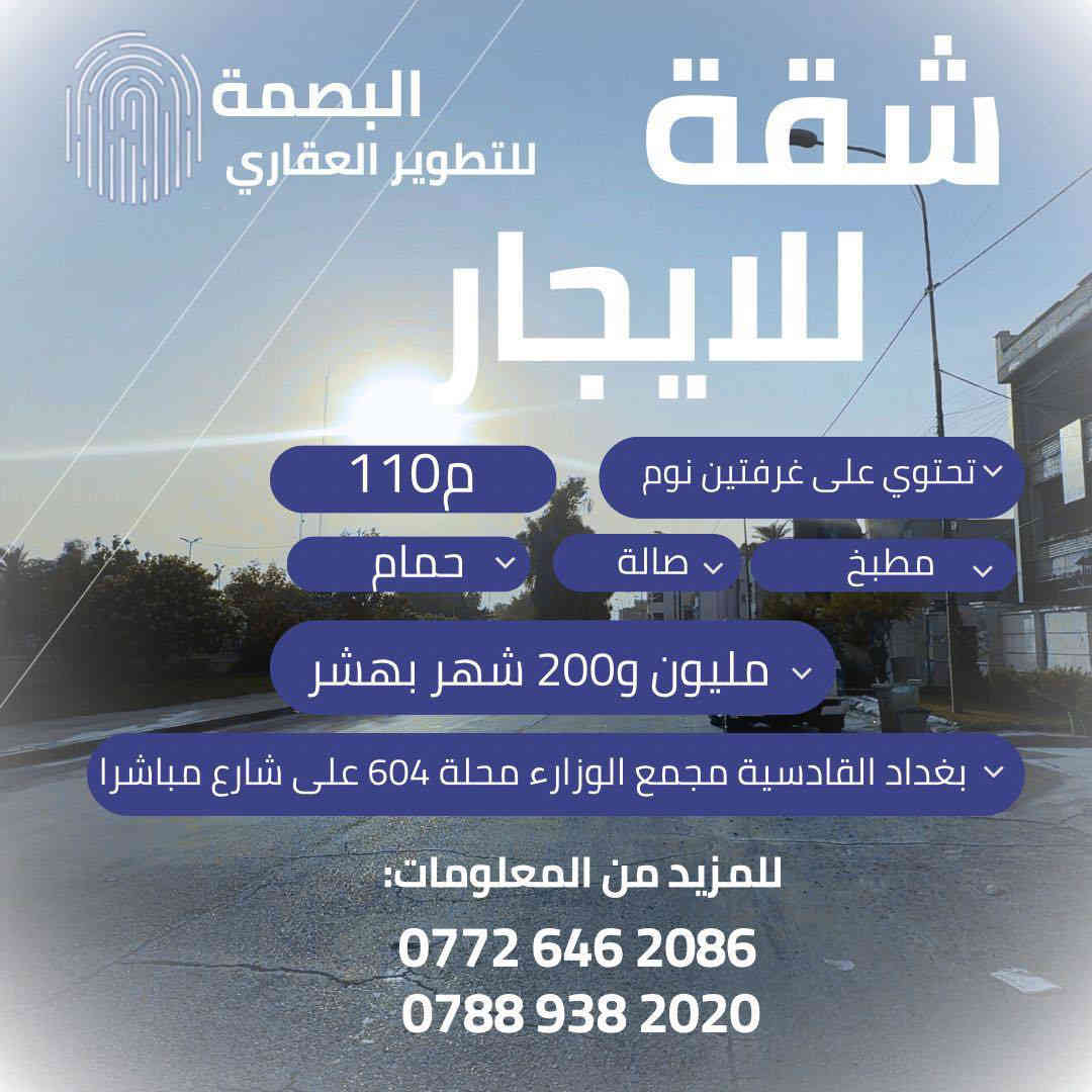 🏡 شقة للإيجار – بناء حديث 📍 بغداد / حي القادسية / محلة 604 📌 مجمع الوزراء – على الشارع العام مباشرة 🔹 المواصفات: • 🏢 طابق أول • 📐 المساحة: 110 متر • 🛏️ غرفتي نوم • 🛋️ صالة مريحة • 🍽️ مطبخ • 🚿 حمّام • 🚗 كراج سيارات • موقع مميز وحيوي وقريب من جميع الخدمات 💰 الإيجار: 1,200,000 دينار عراقي 🔒 القفل شهر بشهر 📞 للاستفسار والتواصل: *********** *********** ✨ مكتب البصمة للتطوير العقاري ثقة • مصداقية • خيارات تناسبك دائماً