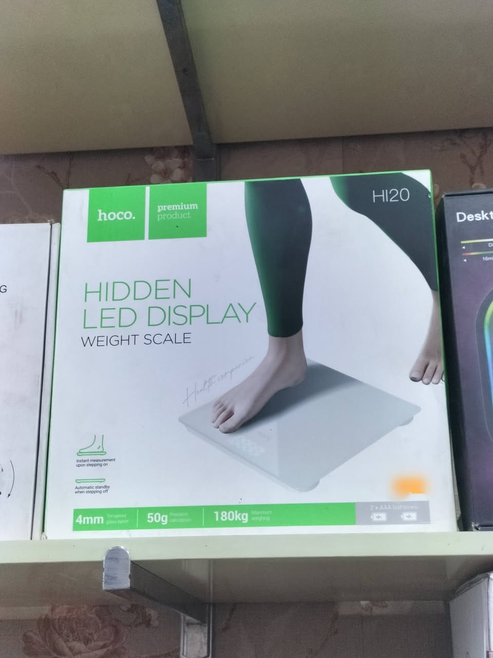 +2 هذا ميزان وزن رقمي Hoco HI20. يتميز بشاشة LED مخفية. سطح الميزان مصنوع من زجاج مقوى بسمك 4 ملم. نطاق الوزن يتراوح من 0.5 كجم إلى 180 كجم. يستخدم مستشعر من النوع E لقياسات دقيقة. يعمل ببطاريتين من نوع AAA. **إذا كنت صاحب هذا الإعلان وتريد حذفه لأي سبب، رجاءا أرسل رسالة إلى الدعم الفني**