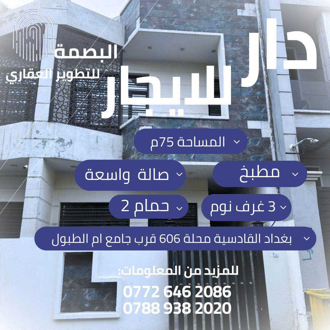 🏡 دار للإيجار – بغداد / القادسية / محلة 606 📍 قرب جامع أم الطبول 🔹 تفاصيل الدار: • المساحة: 75 متر • الدار طابقين • 🛏️ 3 غرف نوم • 🛋️ صالة • 🍽️ مطبخ • 🚿 2 صحيات 💰 الإيجار الشهري: 📍 موقع هادئ ومناسب للعوائل ⸻ ✨ مكتب البصمة للتطوير العقاري ✨ ثقة • مصداقية • خبرة دائماً بخدمتكم 📢 نستقبل كافة العروض: • شقق ومنازل للإيجار • بيع قطع أراضي ومنازل 📍 المناطق حصراً: القادسية • اليرموك • الحارثية 📞 للاستفسار: 📱 *********** 📱 ***********