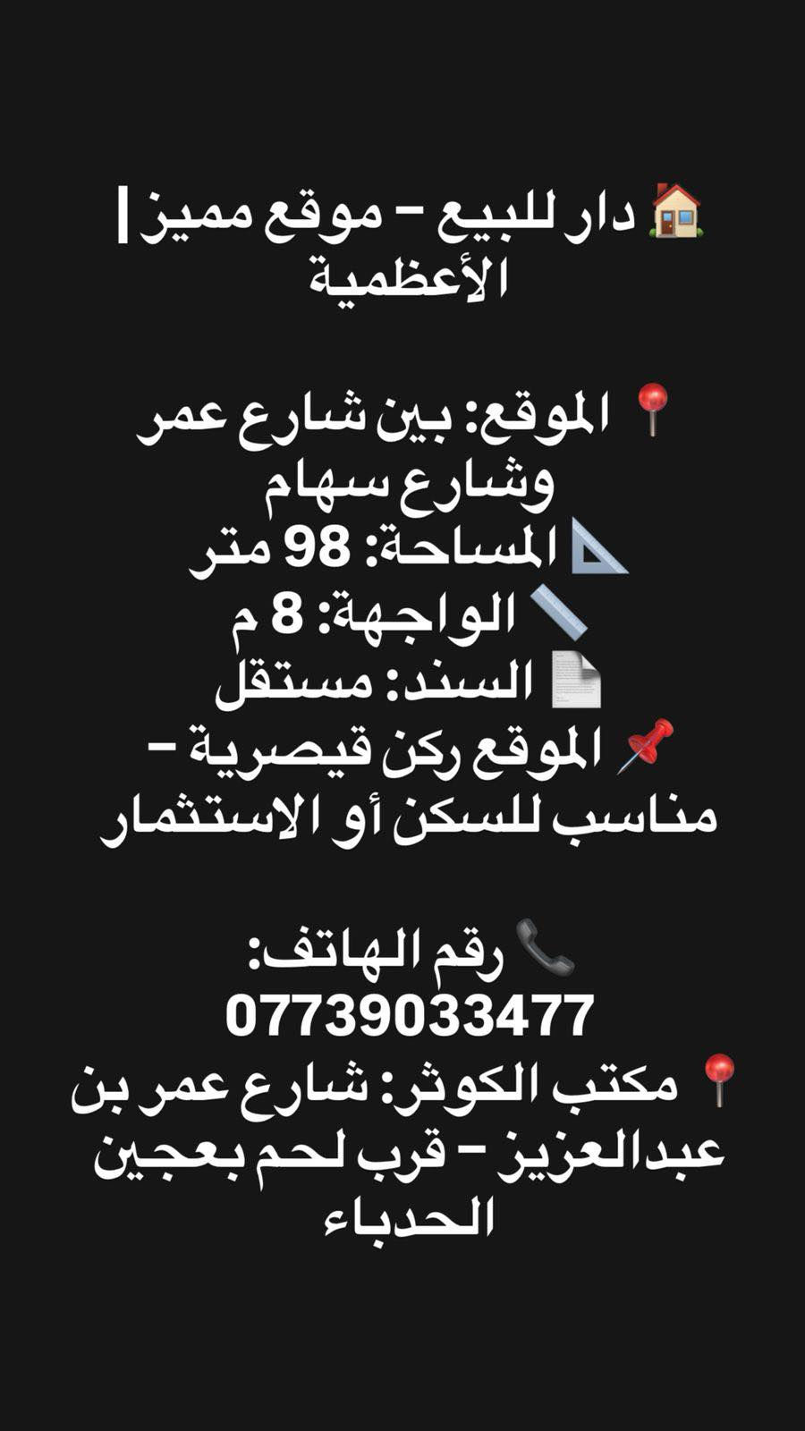 🏠 دار للبيع – موقع مميز | الأعظمية 📍 الموقع: بين شارع عمر وشارع سهام 📐 المساحة: 98 متر 📏 الواجهة: 8 م 📄 السند: مستقل 📌 الموقع ركن قيصرية – مناسب للسكن أو الاستثمار 📞 رقم الهاتف: *********** 📍 مكتب الكوثر: شارع عمر بن عبدالعزيز – قرب لحم بعجين الحدباء