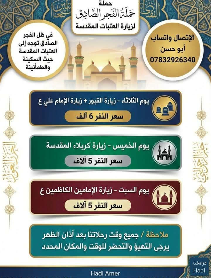 (توكلت على الله ) السبت بعد صلاة الظهر الى الأمام الكاظم (عليه السلام ) النفر (5) ألاف مع تحيات حملة (الفجر الصادق) للأستفسار الاتصال على الارقام (***********)(أو )(***********)
