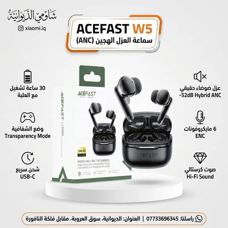 ACEFAST w5 29,000 د.ع ضمان وكالة 6 اشهر استبدال مباشر في حال الخلل المصنعي الهدوء الحقيقي صار بجيبك مع سماعة Acefast W5 الجديدة. تجي بتقنية عزل ضوضاء هجين (Hybrid ANC) تعزلك عن الدوخة بنسبة -52dB! ✨ ليش تختار W5؟ ✅ 6 مايكروفونات لنقاوة صوت خيالية بالمكالمات. ✅ بطارية قوية تمشيك 30 ساعة. ✅ تصميم انسيابي ومريح جداً للأذن. 📍 متوفرة الآن في شاومي الديوانية: سوق العروبة، مقابل فلكة النافورة. 📞 للحجز: *********** 📸 تابعنا: xiaomi.iq