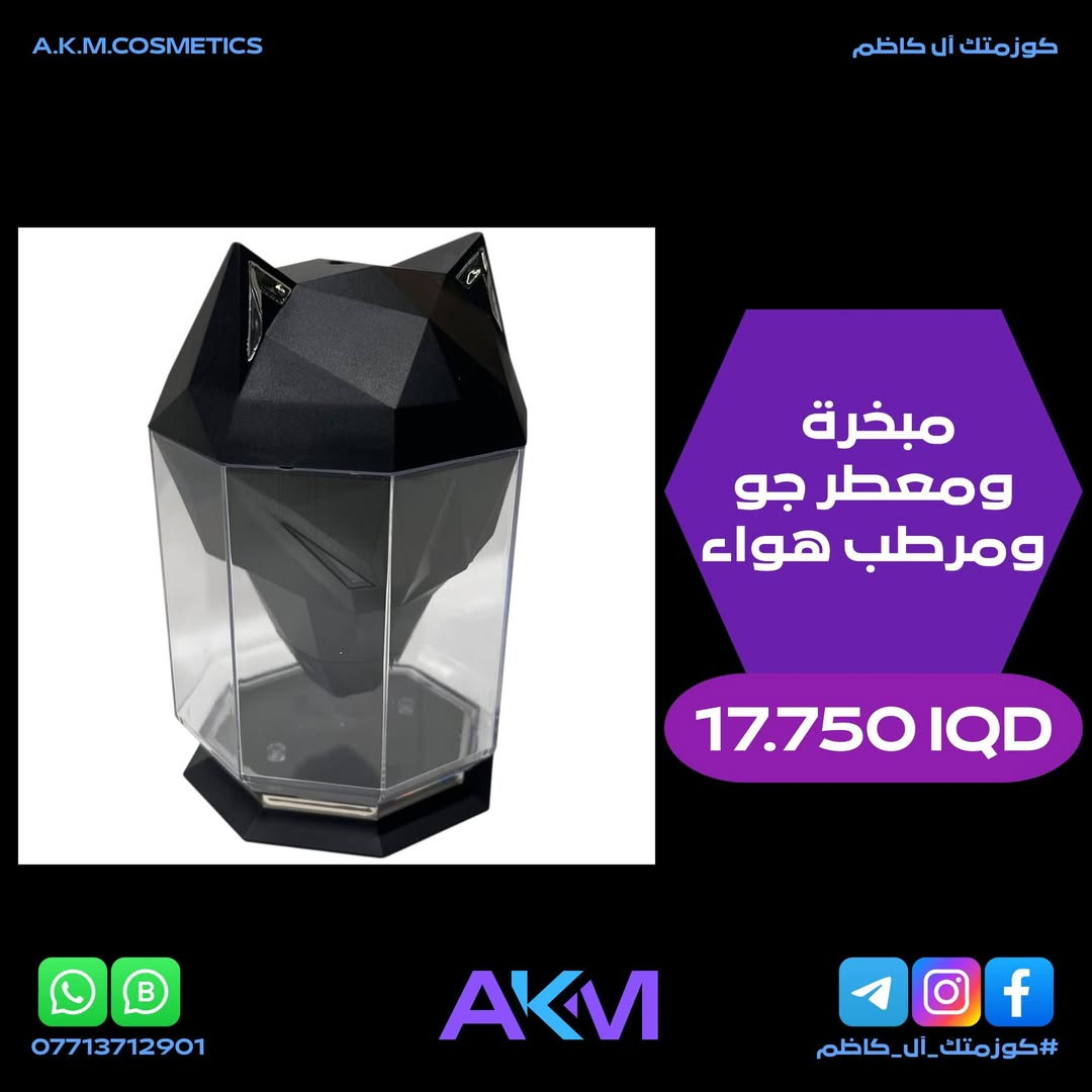 مبخرة ومعطر جو ومرطب هواء الفوائد والمميزات :- - مرطب الهواء هو جهاز يجمع بين التصميم الجمالي المبتكر على شكل رأس ذئب او ثعلب هندسي مع وظائف ترطيب وتنقية الهواء الاساسية. - يعتبر اضافة انيقة لأي ديكور منزلي او مكتبي. - تصميم فريد يتميز بأنه عصري وجذاب على شكل وجه ذئب او ثعلب مما يجعله قطعة ديكور مميزة. - يعمل بتقنية الموجات فوق الصوتية لانتاج رذاذ بارد وناعم مما يجعله هادئ للغاية ومثالي للاستخدام اثناء النوم او العمل. - يشتمل على ضوء ليلي ملون او عيون الذئب المضيئة مما يضيف جو مريح ومهدئ للغرفة. - وظيفة موزع للروائح يحتوي على درج مخصص لاضافة الزيوت العطرية مما يتيح تعطير الجو بروائح مفضلة لخلق جو من الاسترخاء والعلاج العطري. - يأتي بسعة خزان مياه مناسبة مما يوفر وقت تشغيل طويل. - يتم تشغيله عبر منفذ USB مما يجعله محمول وسهل الاستخدام في اماكن مختلفة مثل المكتب او غرفة النوم. - باختصار انه منتج عملي وذو مظهر مميز يساعد على تحسين جودة الهواء واضافة لمسة جمالية وعطرية لمحيطك. سعر المنتج :- 17.750 دينار عراقي توصيل بغداد :- 3.000 دينار عراقي توصيل المحافظات :- 5.000 دينار عراقي #كوزمتك_آل_كاظم #آل_كاظم #AKM_COSMETICS #AKM **إذا كنت صاحب هذا الإعلان وتريد حذفه لأي سبب، رجاءا أرسل رسالة إلى الدعم الفني**