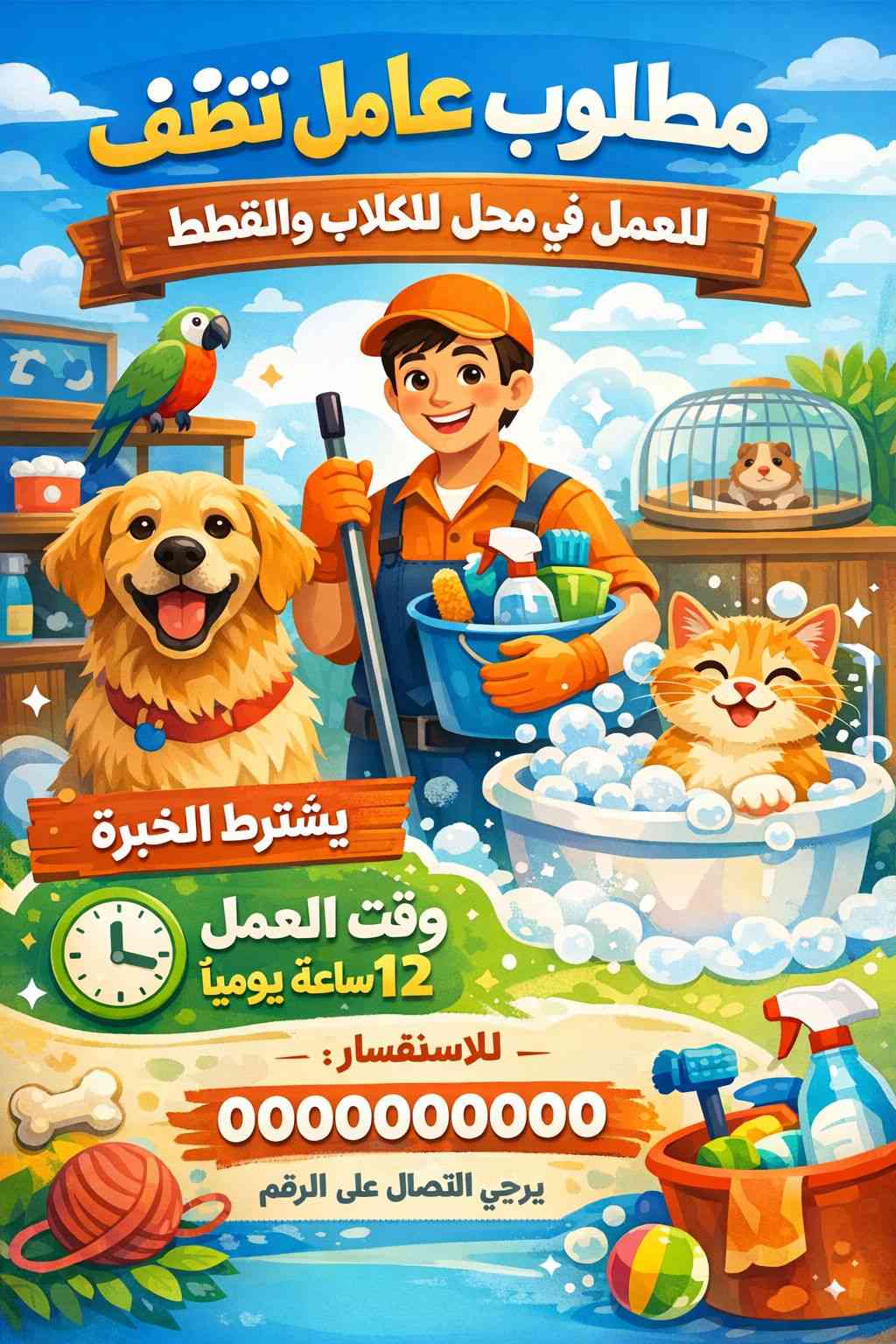 فرصة عمل مطلوب عامل (منظف )في مشتل للحيوانات الكلاب والقطط و اسماك الزينه المشتل. وبشرط: الخبره بالتعامل مع الكلاب و القطط . يمتلك اقامة جديده . مشتل villa للحيوانات الاليفة ومستلزماتها وقت العمل من الساعه ١٠ الصبح الى ٩ مساء . اربيل عينكاوه ١٠٨ وسط شارع المشاتل . ***********