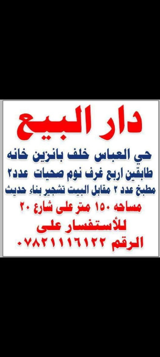 دار البيع حي العامل خلف بانزين خانه منطقه حي العباس االاستفسار ***********