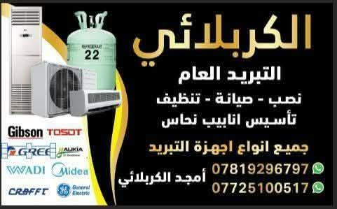 السلام عليكم ورحمة الله وبركاته تخفيض الاسعار بمناسبه الموسم الجديد فقط لهالي كربلاء 1تنصيب سبلت 1طن 35 الف 2تنصيب سبلت 2طن 45الف 3تنصيب سبلت 3 طن٥٠ الف 4تئسيس بواري دفن 1م 35 الف 5 غسل سبلت 25 الف موقعي 6شحن غاز اجود انواع الغاز حسب التعبئه 7 صيانه موقعيه لجميع اجهزه تبريد سبلت مكيف ثلاجه مجمده ماعليك سوا الاتصال بنا ويجيك الفني لباب البيت وبسعارتنافسيه وضمان لجميع عملانا 6 اشهر 8 بيع وشراء جميع اجهزه التبريد 9غسل وتنظيف كافة اجهزه التبريد يسرنا خدمه اهالي كربلاء *********** ***********