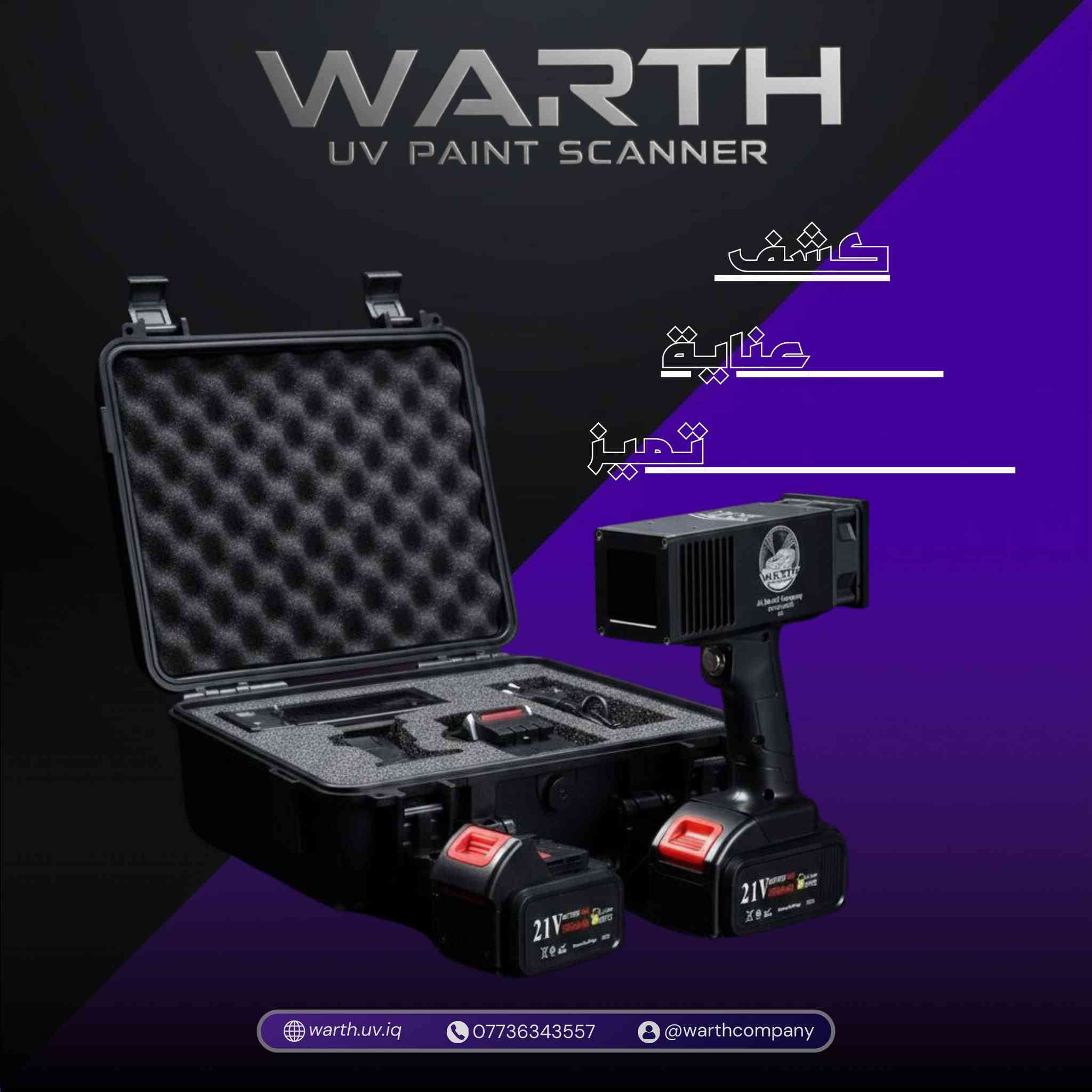 الدقة التي لا تخطئ.. جهاز الوارث Ultra-UV بقوة 100 واط وكثافة ضوئية عالية! إلى خبراء الفحص الفني وأصحاب المعارض، انتقلوا إلى المستوى التالي من الاحترافية مع جهاز فحص صبغ وبدن السيارات بنظام Multi-LED UV. 🛠 المواصفات الفنية المتقدمة: مصفوفة الإضاءة: مزود بـ 25 مصباح UV عالي الكثافة موزعة بدقة لضمان تغطية شاملة لسطح المركبة. القدرة التشغيلية: قوة 100 واط فعلية، تمنحك اختراقاً ضوئياً يكشف تباين طبقات الطلاء (الصبغ) وتواجد المعجون حتى تحت الإضاءة النهارية القوية. كشف العيوب الهيكلية: مصمم خصيصاً لتحديد "أماكن القص" واللحام المخفي التي لا تُرى بالعين المجردة أو الأجهزة التقليدية. نظام الطاقة الذكي: بطارية ليثيوم تدعم ساعتين من التشغيل المستمر (أقصى جهد) وتكفي لـ يوم عمل كامل في ظروف الفحص الاعتيادية. الحماية البصرية: يأتي مع نظارة UV احترافية (هدية) تعمل كفلتر لزيادة التباين اللوني وحماية العين من الأشعة فوق البنفسجية المركزة. 🛡 الضمان والدعم التقني من شركة الوارث: ضمان استبدال حقيقي لمدة سنة كاملة. دعم فني وصيانة مجانية مدى الحياة. توصيل مجاني وسريع لكافة أنحاء العراق. **إذا كنت صاحب هذا الإعلان وتريد حذفه لأي سبب، رجاءا أرسل رسالة إلى الدعم الفني**