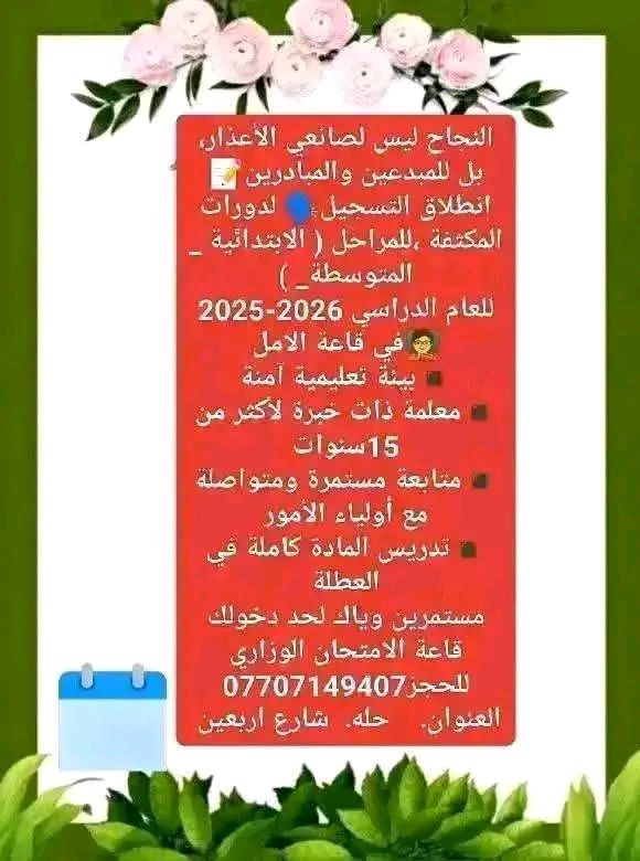 إعلان إعلان إعلان بمناسبة بدء النصف الثاني من المدارس وانتهاء العطله نعلن عن فتح دورات التقويه وبأسعار مناسبة جدا وتتوفر الحقيبه الكاملة لكل المواد المراحل الابتدائية فقط فقط ٥٠ ألف والمتوسطة ٦٥٠٠٠ مساعدة منا إلى الأهالي وطلابنا وطالباتنا الأبطال حتى يحققون أعلى الدرجات للاستفسار خاص أو الاتصال بالرقم *********** بيه واتساب العنوان بابل شارع اربعين ويتوفر تدريس للحالات الخاصه وأهل التوحد وبطيئ التعلم وتعليم القراءه والكتابة لتراكي الدراسة مع تمنياتي لجميع بالنجاح والتفوق