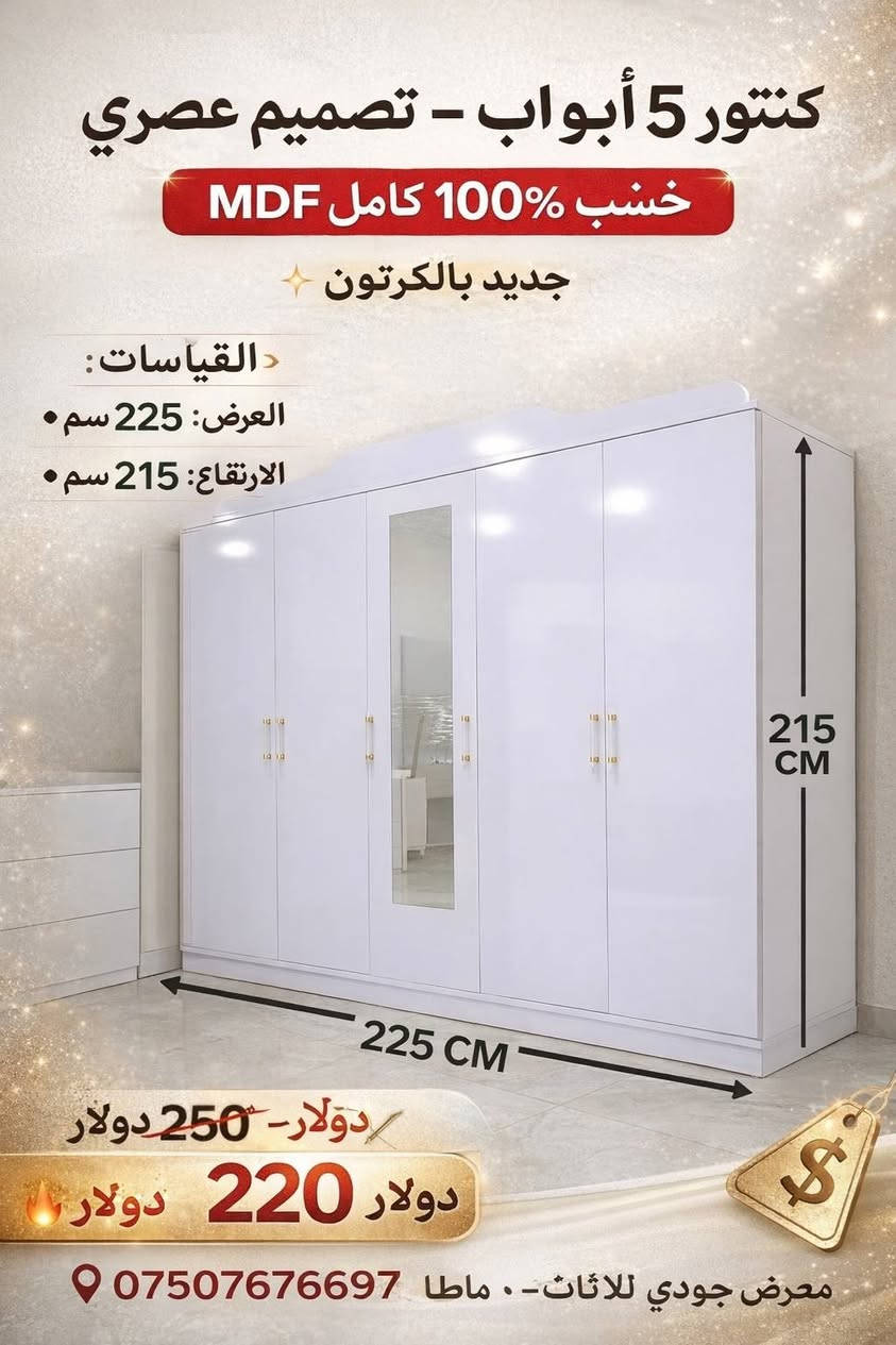 📢 كنتور 5 أبواب كامل خشب MDF ✨ جديد بالكرتون – خامة قوية ومتينة 💸 السعر بعد التخفيض: 220 دولار فقط (بدل 250$) 📍 دهوك – معرض جودي 📞 للتواصل والاستفسار : *********** ------------------- #معرض_جودي_بدهوك 🪑 أثاث تركي فاخر غرف نوم – غرف جلوس – غرف شباب – طاولات – كنتور – أسفنج عالي الجودة ✅ عروض مميزة وأسعار تنافسية 📌 ناونیشان: ⛔مالطا خاری-فرعی ئکی به ری سیناعی- به مبه ری مه دره سه (مالتاژئری) 📌 العنوان: دهوك – مالطا القديم – أول فرع قبل صناعة تصليح السيارات – مقابل مدرسة الابتدائية (قريب من مطعم مالطا – كونديه مالطا – خارنگه ها مالتا) #دهوكا_رنكين #موصل #خزائن_ملابس #اثاث_منزلي #زاخو