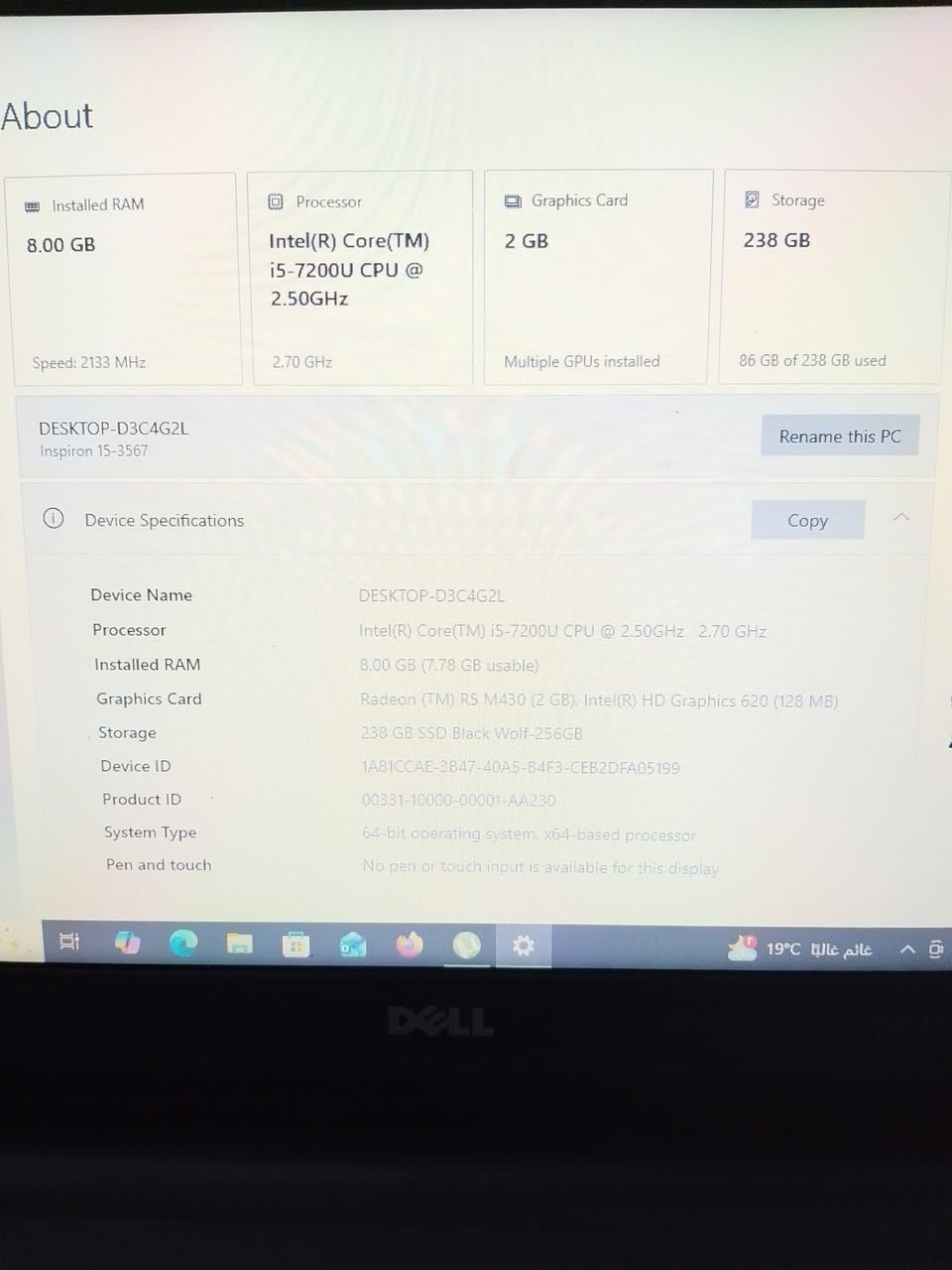 السلام عليكم للبيع لابتوب دل كوراي 5 جيل السابع رام 8 كيكا هارد 256 ssd كارت شاشه خارجي 2كيكا amd والداخلي 4كيكا نظافتها جيده السعر 180 وبيها مجال قليل **إذا كنت صاحب هذا الإعلان وتريد حذفه لأي سبب، رجاءا أرسل رسالة إلى الدعم الفني**