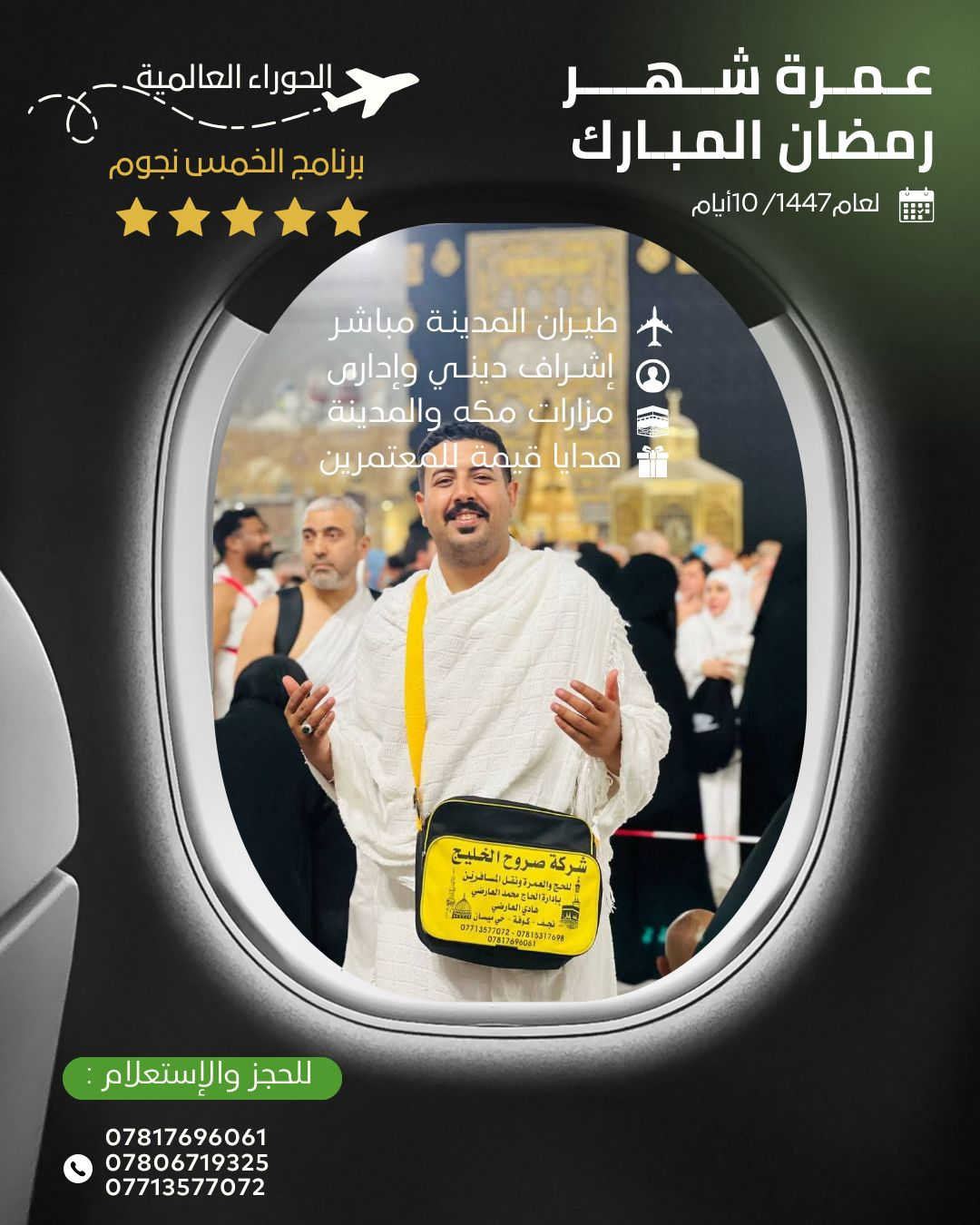 ✨ شركة الحوراء العالمية للسياحة والسفر ✨ 🕋 **عمرة #رمضان_شوال **🕋 ⏱️ **مدة الرحلة: 10يوم / 9 ليالي** 🟢 تفاصيل الإقامة: 2ليالي في المدينة المنورة 🕌 7 ليالي في مكة المكرمة 🕋 🕋 برنامج الرحلة يشمل: 1️⃣ تأشيرة الدخول 🧾 2️⃣ تذكرة طيران مباشر إلى المدينة المنورة ✈️ 3️⃣ الإقامة في: محيط محبس الجن بمكة المكرمة فنادق مركزية في المدينة المنورة 4️⃣ وجبات طعام ثلاثية يومياً 🍴 5️⃣ زيارة مزارات مكة والمدينة المنورة 🌟 6️⃣ مزارات جديدة بالمدينة المنورة ❗️ 7️⃣ هدايا مميزة لكل معتمر قبل السفر 🎒 8️⃣ رحلة اختيارية سياحية إلى جدة 🌊 9️⃣ إقامة بغرف رباعية وخماسية (غرف ثنائية متوفرة مقابل رسوم إضافية). 🔟 إرشاد ديني + ارشاد سياحي طوال الرحلة ✨ 📄 ملاحظات هامة: جميع الأعمار مسموح بها. يُرجى تقديم جواز السفر وصورة ملونة (عدد 1) للتسجيل. —————————————————— 📍 مقر الشركة: النجف الأشرف / الكوفة –حي ميسان ،نفق المختار .مقابل جامع العامري ⏰ أوقات الدوام: يومياً من 9 صباحاً حتى 10 مساءً. 📞 للحجز او الاستفسار من الزر اسفل المنشور او على الارقام ***********📞 ***********📞 ***********📞 29WC+CRR, Kufa, Najaf Governorate