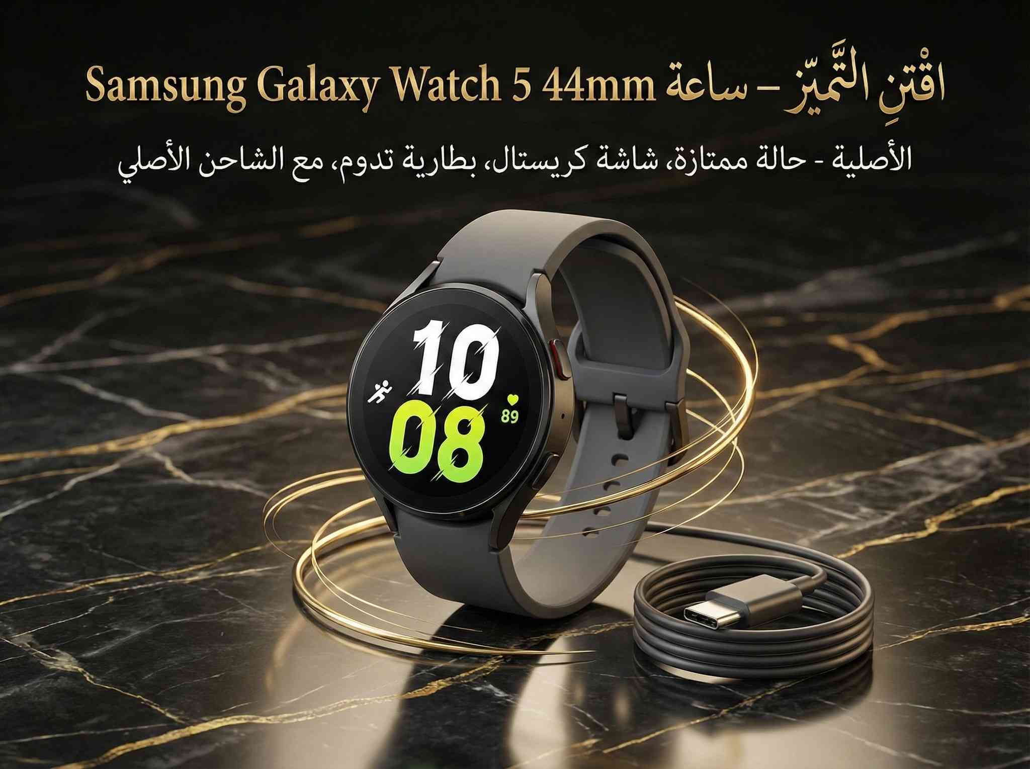 للبيع ساعة سامسونج (Galaxy Watch 5) أصلية - حجم 44mm - نظيفة جداً التفاصيل: الموديل: Samsung Galaxy Watch 5 (SM-R910). الحجم: 44mm (الحجم الكبير). الحالة: الساعة نظيفة جداً، الشاشة كريستال (صافية بدون خدوش)، البطارية أداء ممتاز (يومين تقريباً حسب الاستخدام). الملحقات: الشاحن الأصلي (Type-C) موجود. **إذا كنت صاحب هذا الإعلان وتريد حذفه لأي سبب، رجاءا أرسل رسالة إلى الدعم الفني**