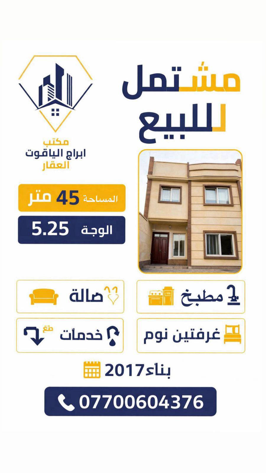 🏢مشتمل للبيع في قلب الأعظمية 🏢 يعلن مكتب أبراج الياقوت للعقار عن توفر مشتمل بمواصفات ممتازة وموقع المساحه 45م الواجه 5.25 📍 الموقع: الأعظمية – شارع عمر بن عبد العزيز (موقع حيوي وقريب من كافة الخدمات) 📋 تفاصيل المشتمل: • يتكون من: • 🛋️ صالة واسعة. • 🛏️ غرفتين مريحة.• • 🚿 خدمات (حمام) . 📞 للحجز والاستفسار: : 👉 *********** مكتب أبراج الياقوت للعقار.