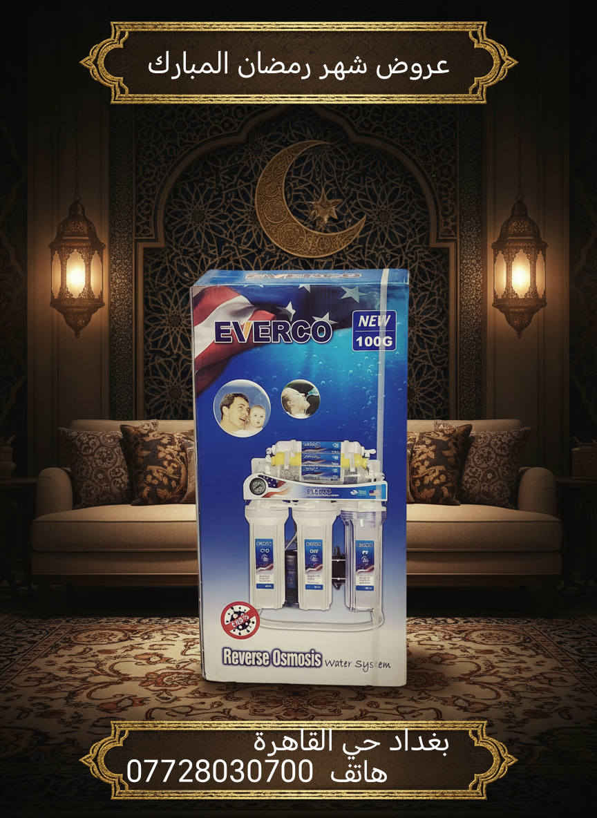 بمناسبة شهر رمضان المبارك يسرنا ان نعلن لكم عن عروض هذا الشهر الكريم ونقدم لكم منظومة تصفية المياه المنزلية EVERCO الماطور 100 كالون 7 مراحل. العرض يشمل سيت فلاتر نوع ( SANAKY ) هدية مع كل جهاز يتم شراءه خلال الشهر الفضيل . التركيب و التوصيل مجاني داخل محافظة بغداد الحبيبة. للمزيد من المعلومات و الحجز راسلنا او اتصل بنا على الرقم *********** صيانةفلاترالمياه المنزلية . خلي فطورك هل السنة انقى واطيب .