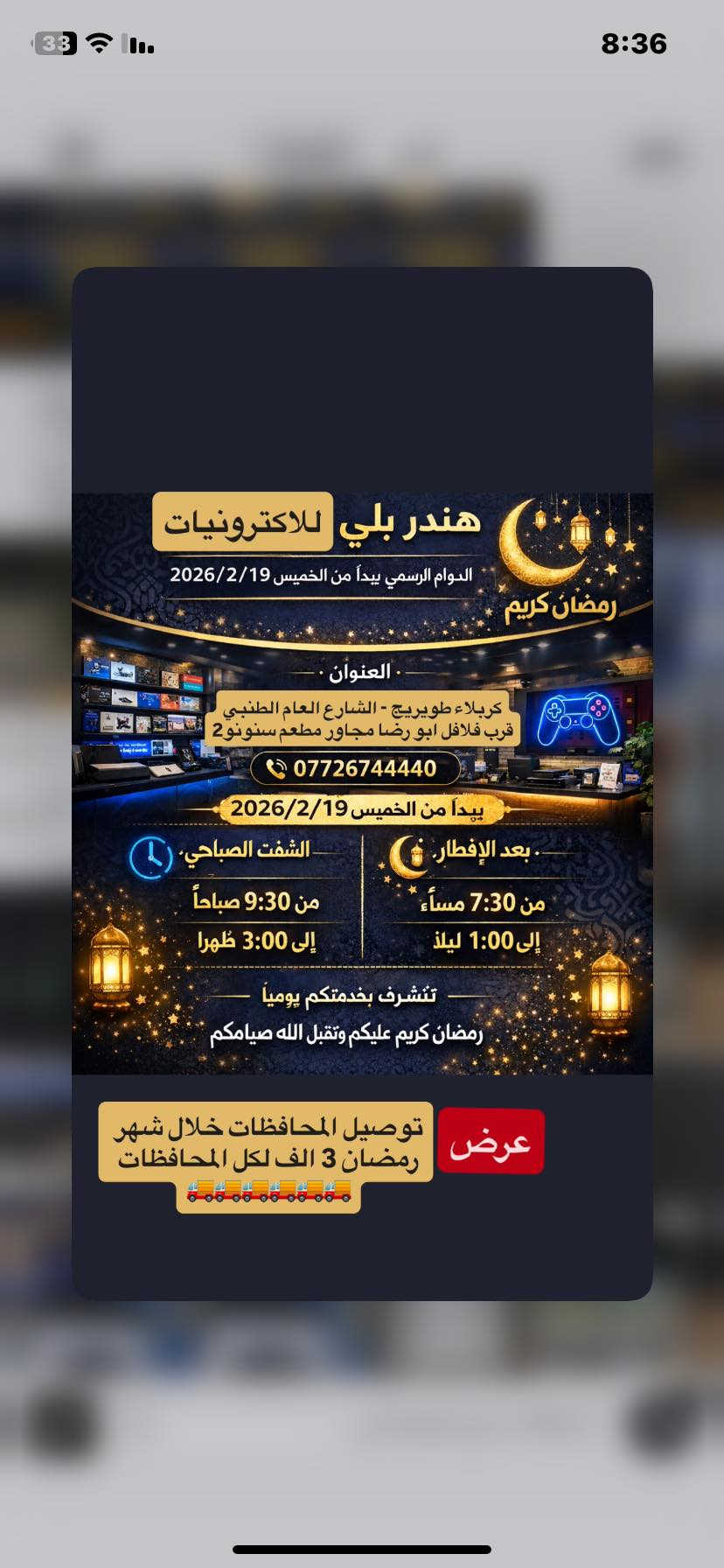 مركز هندر بلي 🎮 أوقات الدوام – رمضان كريم 🌙 📍 كربلاء – طويريج – الشارع العام – الطنبي قرب فلافل أبو رضا مجاور مطعم سنونو2 📞 *********** 🚚 عرض التوصيل لكل المحافظات 3 آلاف دينار فقط 🕘 الشفت الصباحي من 9:30 صباحاً إلى 3:00 ظهراً 🌙 بعد الإفطار من 7:30 مساءً إلى 1:00 ليلاً 🔹 تنزيل ألعاب 🔹 مراوس 🔹 أقراص 🔹 بيع وشراء مراوس 🔹 أرصدة 🔹 جويستك 🔹 صيانة 🔹 شدات ببجي ✨ نتشرف بخدمتكم يومياً رمضان كريم عليكم �