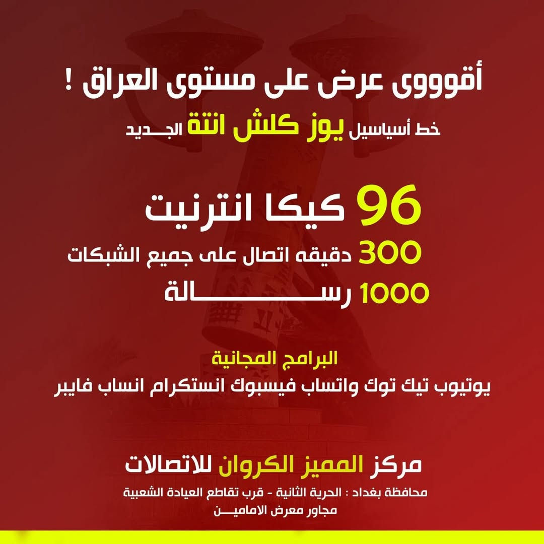 خط يوز كلش أنت الجديد خدمة شهرية بسعر............ 96 كيكا .... 300 دقيقة اتصال على جميع الشبكات +1000 رسالة ... + انترنيت فري سوشل ميديا مجانا فيسبوك سناب واتساب فايبر انستكرام تيك توك يوتيوب 💥 ✅من مركز المميز الكروان للاتصالات ✅💥 العنوان بغداد الحرية الثانية قرب تقاطع العياده الشعبيه 🟥🔷 ♨️مجاور معرض الامامين ♨️ المستمسكات المطلوبه الجنسيه الاصليه و البطاقه السكن الاصليه 💠 وحضور صاحب المستمسكات شخصيا👨👦👦🤳👉 الاستفسار ع الرقم📞👉 *********** متواجدين من الساعه 9 صباحا الى الساعه 11 ليلا🕙