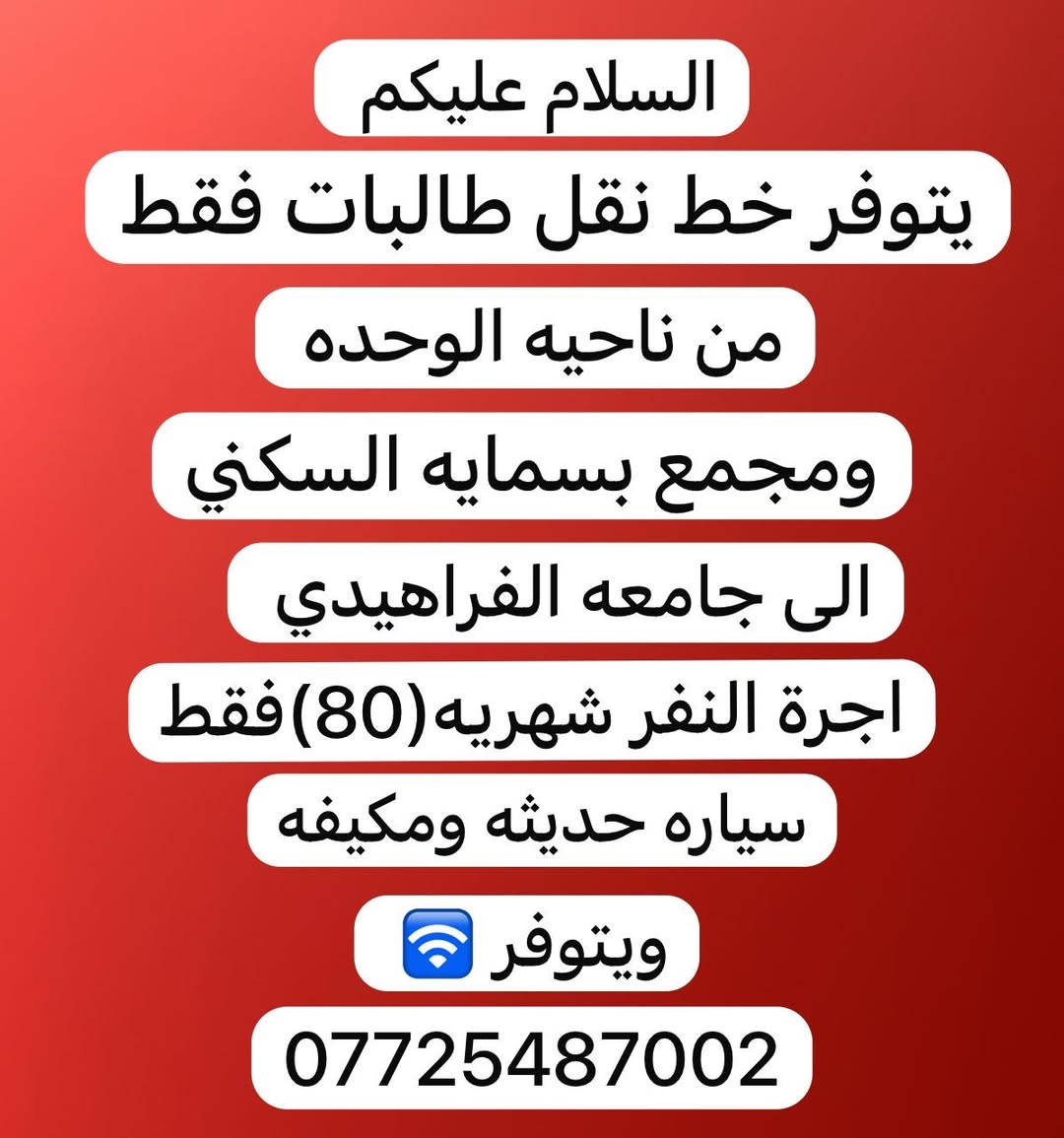 السلام عليكم يتوفر خط نقل من ناحيه الوحده وبسمايه الى جامعه الفراهيدي الدوام جميع ايام الاسبوع طالبات فقط سياره حديثه ومكيفه ***********