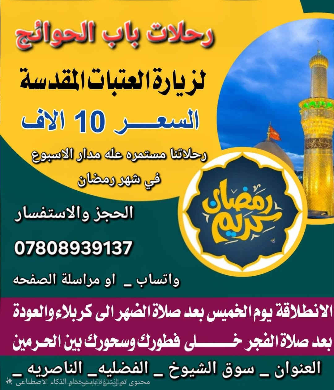 في شهر رمضان المبارك ✅ تعلن رحلات باب الحوائج(ع) الى زيارة العتبات المقدسه 🕌 في سهر رمضان المبارك. 👈 المصادف يوم الخميس الانطلاقه بعد صلاة الظهر ساعه 1 مساءا تكون الانطلاقه الي كربلاء المقدسه بسعر 10 الف دينار حجز والاستفسار *********** المتعهد / سيوفي الحرباوي