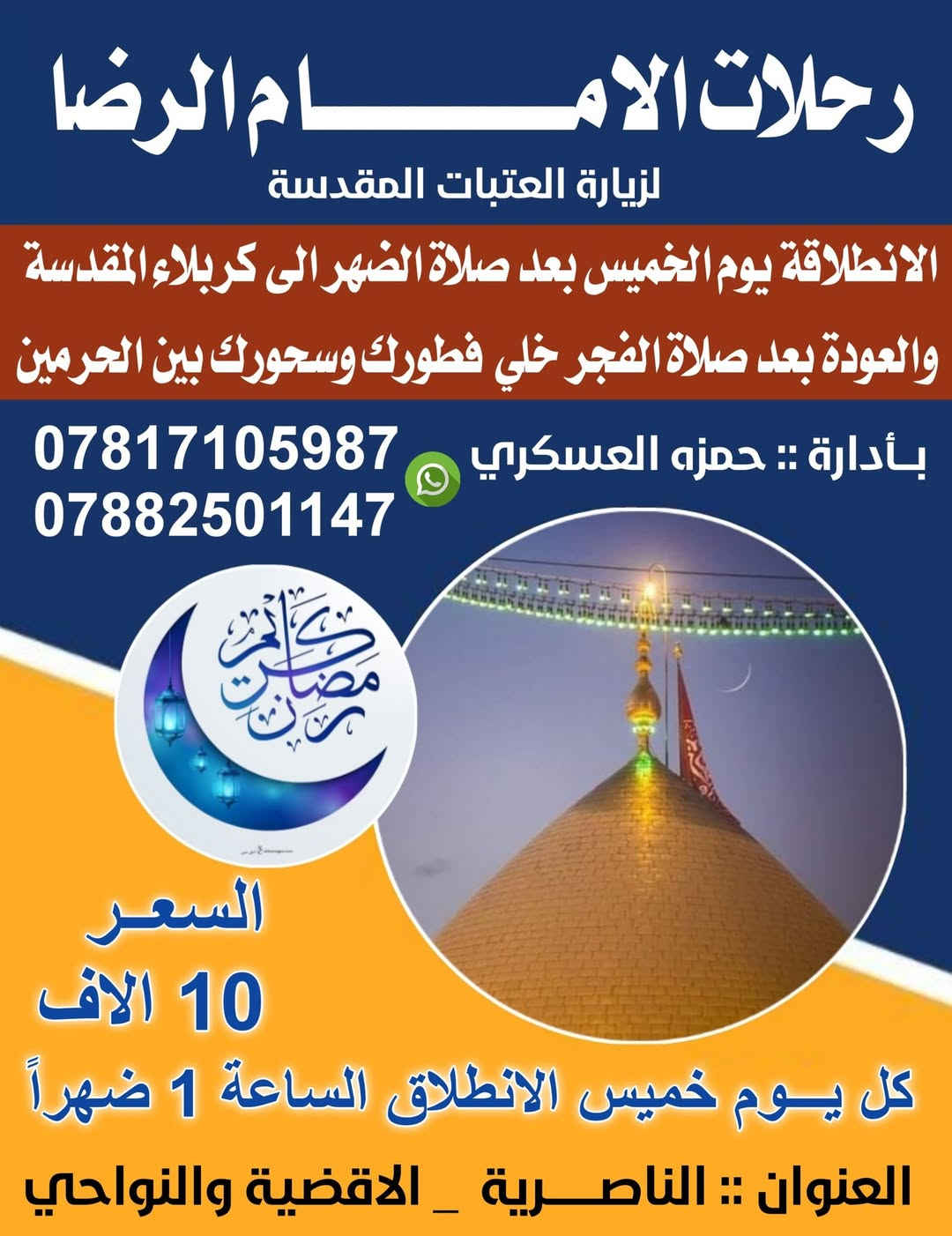 #موعدنا يوم الخميس بعد صلاة الضهر إلى كربلاء المقدسه العوده ثاني يوم بعد صلاة الفجر اسرع الحجز قبل اكتمال عدد كل #خميس في #رمضان #المبارك مع رحلات الامام الرضا ع