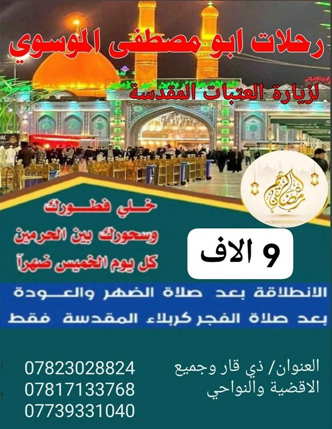 🌙 كل عام وانتم بألف ألف خير 🌙 🌟 رمضان يجمعنا 🌟 🌹تعلن رحلات ابومصطفئ🌹 الموسوي🤲 💧 رحلاتها الئ كربلاء المقدسة فقط 💧 الإنطلاقه يوم الخميس بتاريخ 2026/2/19 سوف تكون انطلاقتنا الئ كربلاء كل خميس بعد صلاة الضهر♦️ ويكون الافطار والسحور في كربلاء المقدسة والعوده بعد صلاة الصبح ♦️ 👈👈كل هذا بسعر مغري النفر ( 9 ) الاف فقط 👉 ✅ سارع بلحجز قبل اكتمال العدد ☎️للحجز والاستفسار 📱على الأرقام التاليه *********** 📱*********** - *********** واتساب أو اتصال او مراسلتنا على الصفحه خاصه خدمتكم شرف لنا ✅ العنوان /سوق الشيوخ - فضليه - ناصريه مركز ✅ المتعهد ابو مصطفى الموسوي