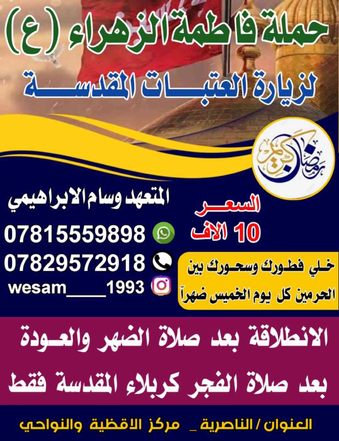 🔴رحلات فاطمة الزهراء ع 🔴 🔴المتعهد وسام الإبراهيمي 🔴 🌐واتساب *********** 🕳🕳🕳🕳🕳 💥خلي فطورك في كربلاء المقدسه ✅رحلاتنا كل خميس بعد صلاة الظهر ✅الفطور والسحور في كربلاء 🔴والعوده بعد صلاة الفجر إلى الاهل ✅ النفر 10 آلف دينار أجرة السياره فقط 🕳🕳🕳🕳🕳🕳🕳🕳🕳🕳 1️⃣الفرع الاول//ناصرية مركز مستشفى القلب 2️⃣الفرع الثاني// ناصريه خطوة الامام علي 🕳🕳🕳🕳🕳🕳🕳🕳🕳 ✅المتعهد //وسام الإبراهيمي ✅واتساب *********** ✅اتصال ***********