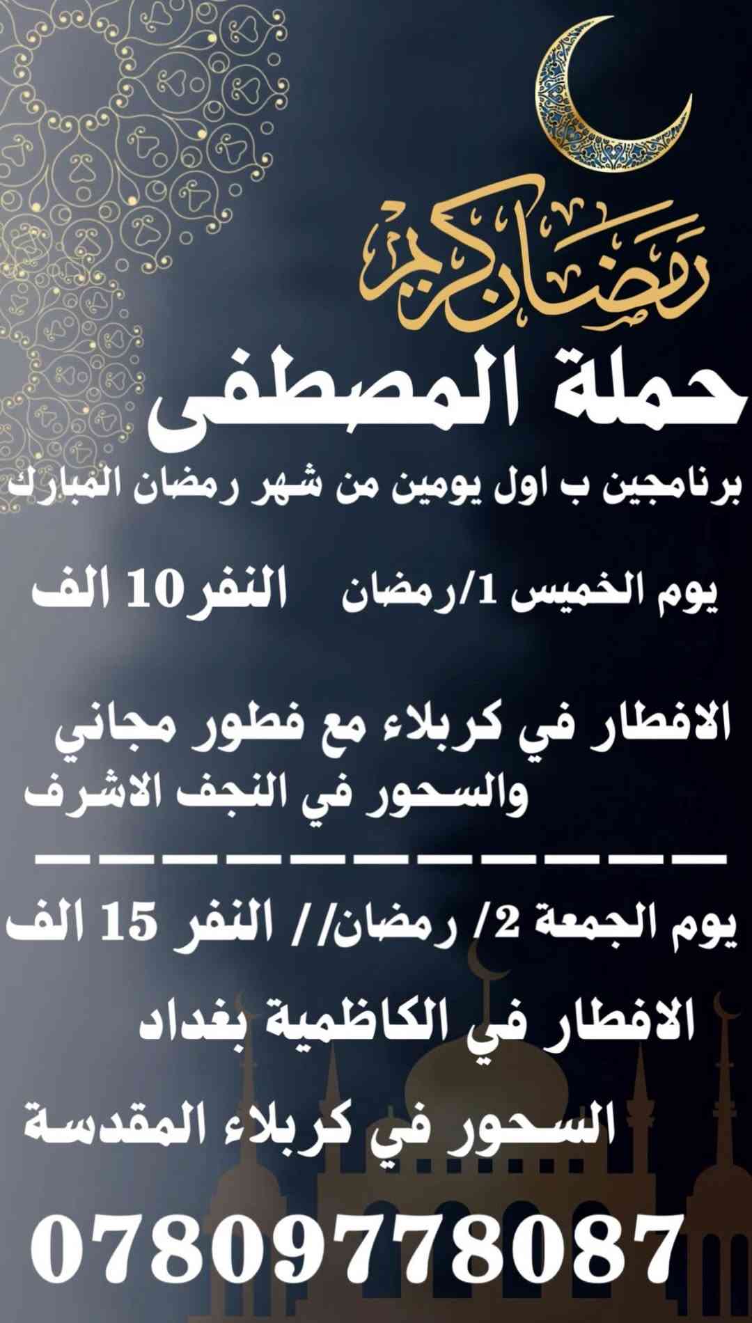 #حملة___الــمـصـطـفــى لزيارة العتبات المقدسة /// #رمضان_كريم // برنامجين ذهبيات ب اول يومين من شهر رمضان #السماوة #الرميثة #الوركاء #المجد #السوير#الهلال يوم الخميس 1/ رمضان النفر #10الف فقط 👉 الافطار في كربلاء مع #فطور_مجاني 🥣🥞🕌 السحور في #النجف الاشرف 💫🌕 ____________________________________ يوم الجمعة 2/رمضان ⚡️النفر #15الف الافطار في #الكاظمية / بغداد 🥣🥞🌕🕌 السحور في #كربلاء_المقدسة 🕌 السياره تجيك #لباب_البيت وبخدمتكم اهلنا وناسنا الانطلاق بعد صلاة الضهر ان شاءالله مكان التجمع #القشلة_قرب_حسينية_السبطين للحجز /*********** //ابو مصطفى الشمري