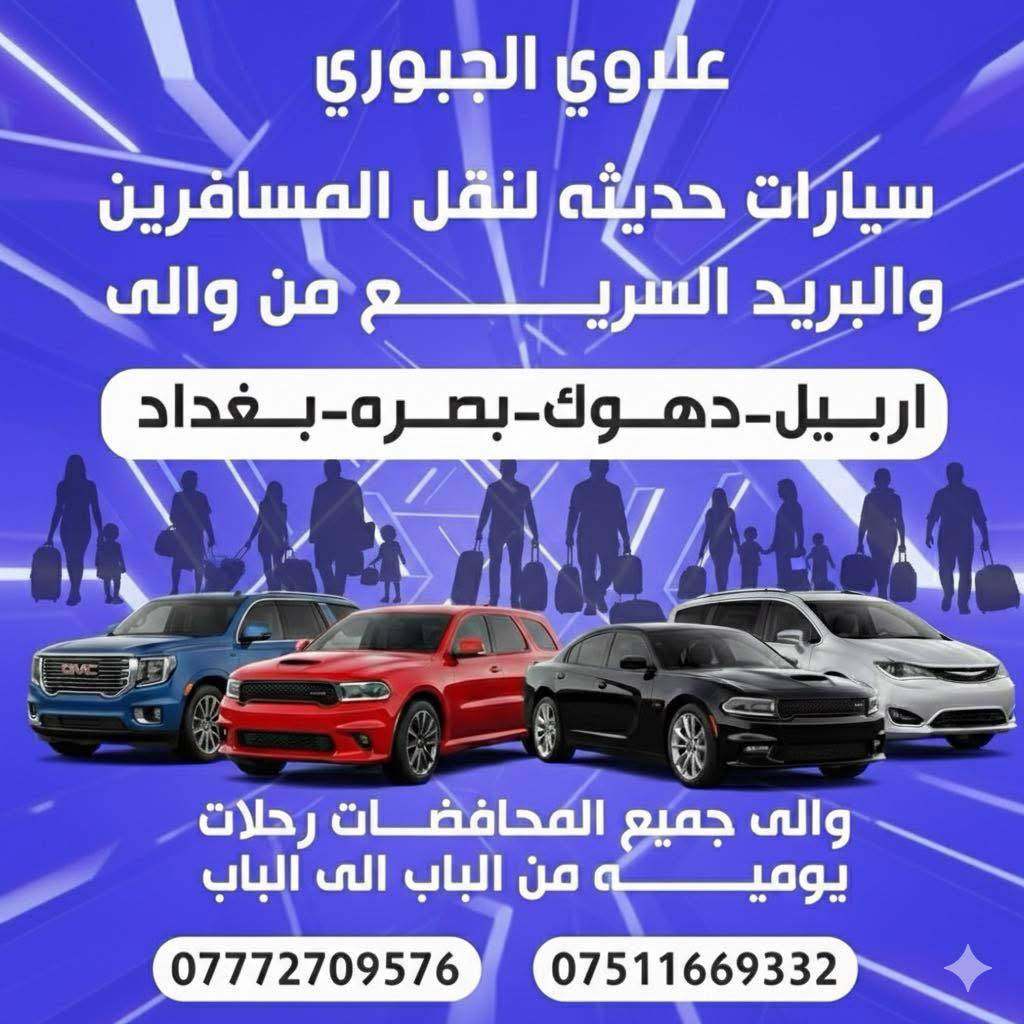 سلام عليكم 👇🤚 نقل المسافرين والبريد السريع سياره جارجر أوباما جمسي يوكن دوج كرفان سفانة موصل بغداد دهوك بغداد زاخو بغداد بغداد بصرة... وبالعكس بغداد ناصرية... وبالعكس بغداد اربيل... وبالعكس بغداد سليمانية... وبالعكس بغداد كركوك... وبالعكس بغداد دهوك... وبالعكس بغداد موصل... وبالعكس بغداد تكريت... وبالعكس بغداد ديالى... وبالعكس بغداد رمادي... وبالعكس بغداد كوت... وبالعكس بغداد عمارة... وبالعكس بغداد ديوانيه... وبالعكس بغداد نجف... وبالعكس بغداد كربلاء... وبالعكس بغداد حلة... وبالعكس بغداد سماوة... وبالعكس للاتصال 👈 واتساب *********** للاتصال 👈 واتساب ***********