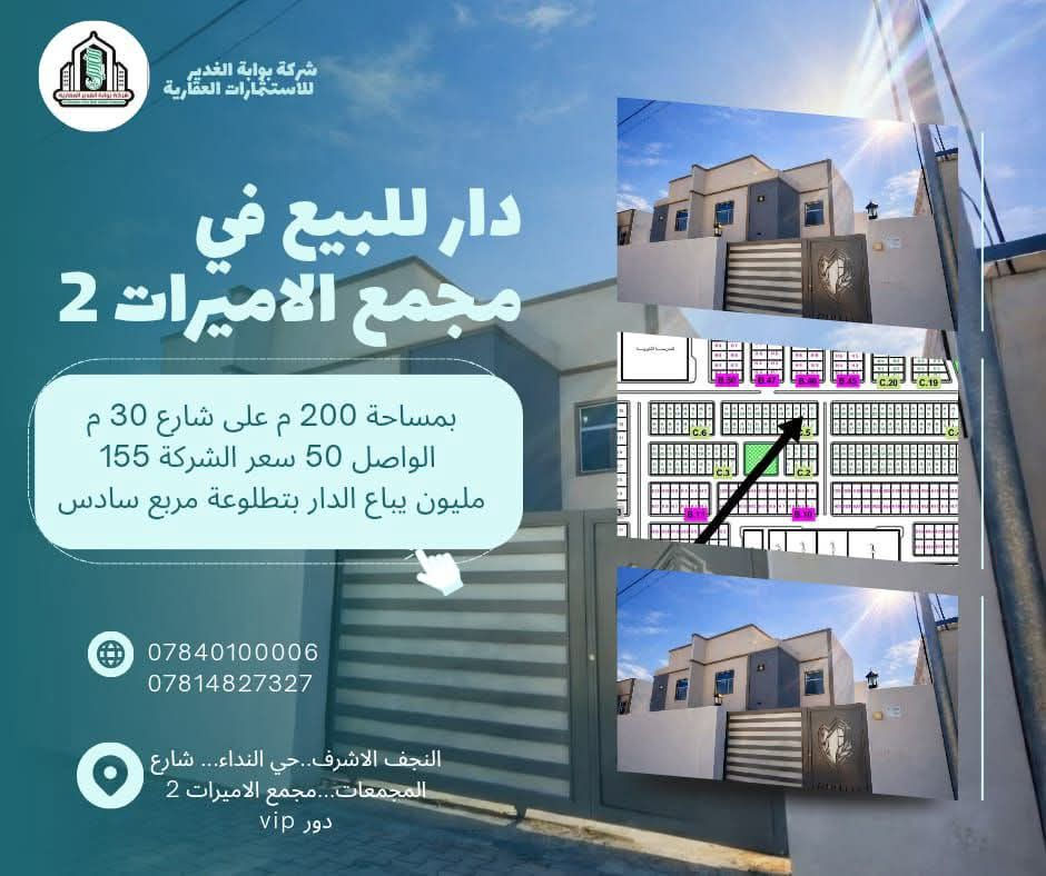 دار للبيع في #مجمع_الاميرات2_السكني🏘 ⭕دار للبيع بلوك 5... دار 4.مساحة 200م ⭕مربع سادس ..سعر الشركة 155 ⭕موقعه على شارع 30 م...الواصل 50 ✨ مواصفات البيت: طابقين – بناء درجة أولى 3 غرف نوم واسعة صالة + استقبال أنيق مطبخ عملي + صحيات متكاملة كراج سيارة كبير حديقة كبيرة مثالية للعائلة والخصوصية الاستفسار الاتصال على الارقام التالية واتساب : ☎️*********** ☎️*********** 🌏موقع الشركة النداء _شارع المجمعات _مجمع الاميرات 2_الدور ال vip