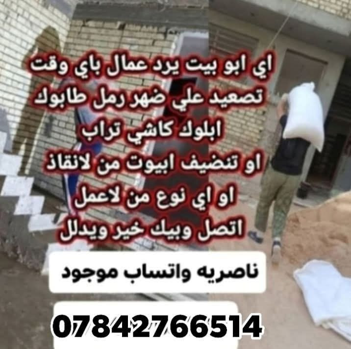 عمال تصعيد عل ضهر وبسعر مناسبه رمل طابوك شتايكر وتنضيف وتدخيل وكافت المكطوعات وتربيع وصب ارضيه خابرني وتدلل مكاني ناصريه ***********