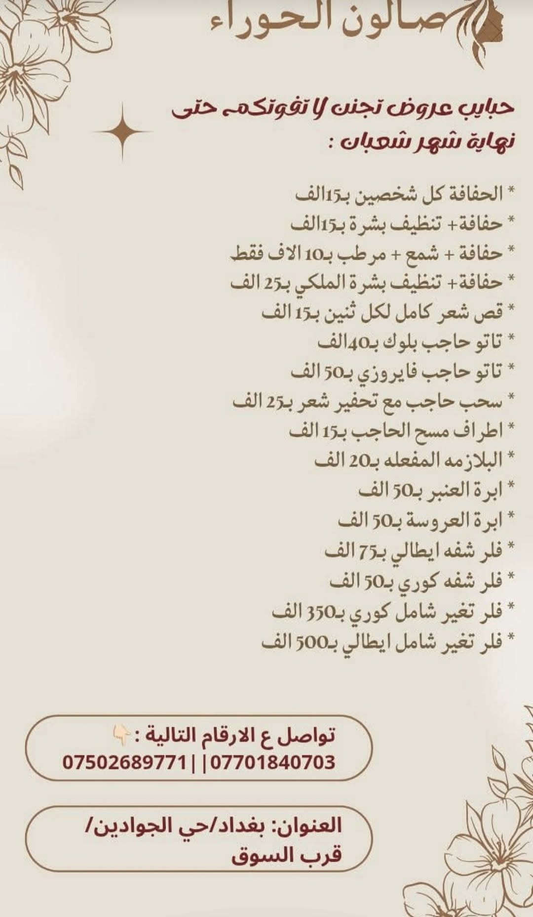 عيني حبايب نساء الجوادين ام سجاد صالون الحوراء مسويتلكم عروووض. تخبل وجربو الشغل واحكمو حرامات تفوتكم العرووض