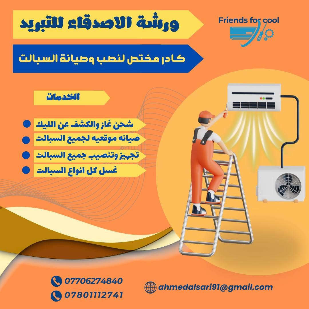 ⚒️⚒️ورشة الاصدقاء⚒️⚒️ نصب سبالت 🛠️ وصيانة 🔩 وتنظيف 🚿 كافة أنواع أجهزة التبريد موقعياً وبكادر متخصص 👷🏻♂️ عندك صيانة أو تنظيف؟ لا تحتار، اتصل نجيك لباب بيتك. ما عليك سوى الاتصال. خدماتنا: صيانة - شحن غاز - نصب - غسل - عمل فاكيوم 🎰 الأرقام: *********** ☎️ *********** ☎️