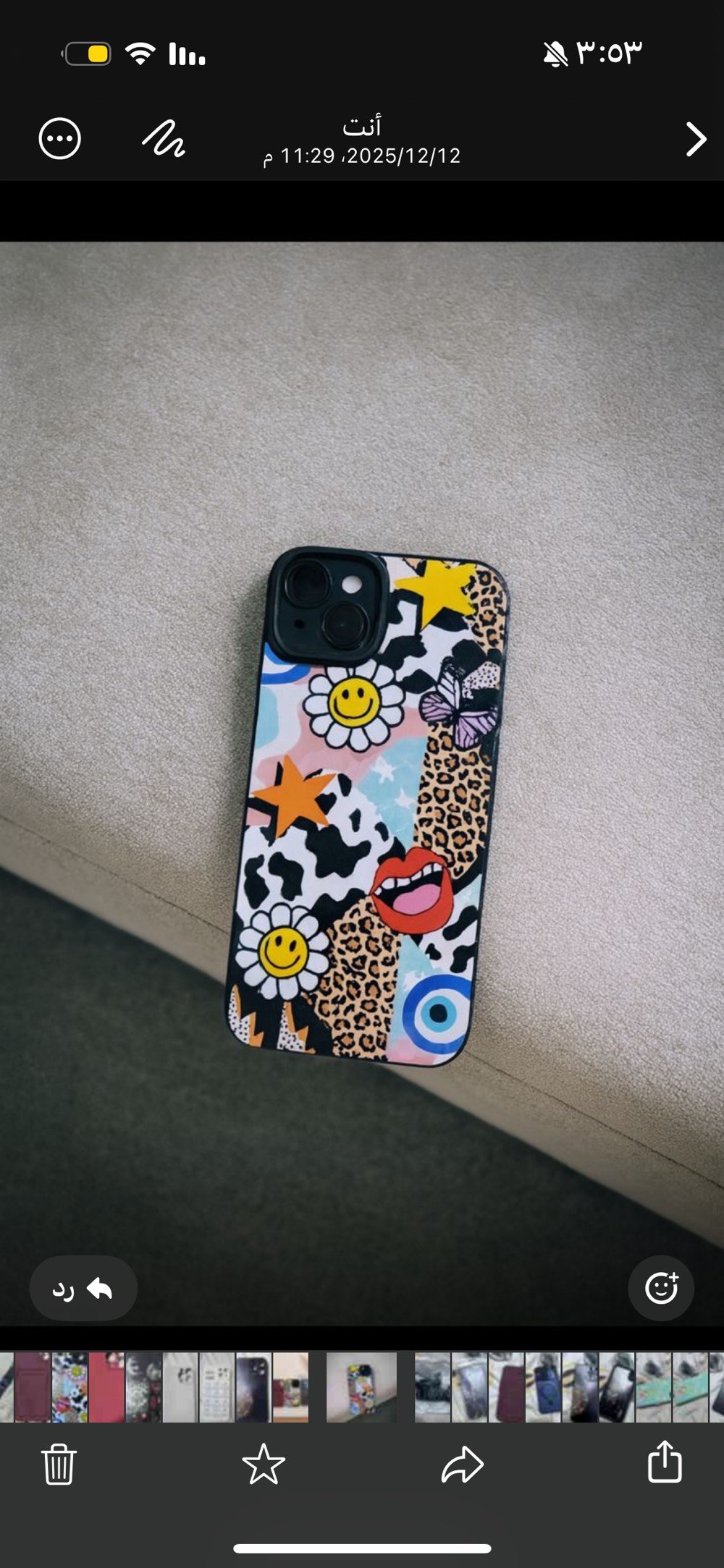 كفر آيفون أنيق بتصميم فني مميز يجمع بين الألوان الزاهية والرموز الجذابة مثل الوجوه المبتسمة، والنجوم، والفراشات. مناسب لمحبي التميز والتعبير عن الشخصية بأسلوب فريد.