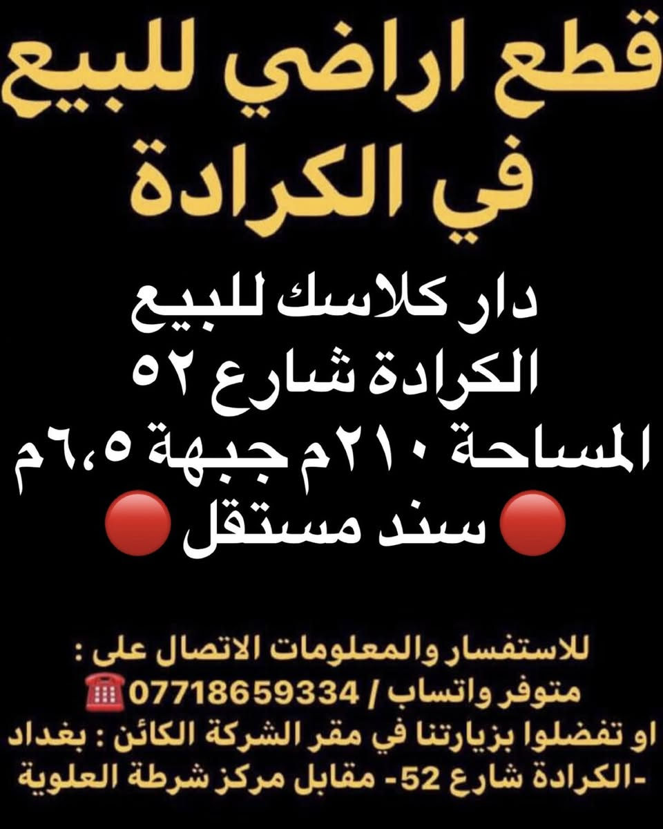 � عروض حصرية من شركة السهل للعقار 🔶 📍 الكرادة – شارع 52 🏠 دار كلاسك للبيع 📐 210 م² | واجهة 10.5 م 📄 سند مستقل 📍 الكرادة – بارك السعدون 🏡دار للبيع بناء سنة 2015 📐 المساحة 367 م² جبهة 11 م² 📍 الكرادة – شارع 42 📐 قطعة أرض للبيع المساحة 450 م² | واجهة 11 م 📍 الكرادة – شارع 62 🏠 دار حديث للبيع 📐 96 م² | واجهة 5 م ✅ مواقع استراتيجية وقريبة من الخدمات ✅ سندات رسمية جاهزة للتحويل ✅ مناسبة للسكن الراقي أو الاستثمار المضمون ⚠️ الطلب عالي والعروض محدودة ⚠️ الحجز للجادين فقط 📞 اتصل الآن واحجز موقعك قبل لا تخلص الخيارات: ☎️ *********** ☎️ *********** 📲 متوفر واتساب 📍 عنوان المكتب: الكرادة – شارع 52 - مقابل مركز شرطة العلوية 🔥 اليوم قرارك… باچر السعر أعلى #الكرادة #عقارات_بغداد #بيع_اراضي #شركة_السهل_للعقار