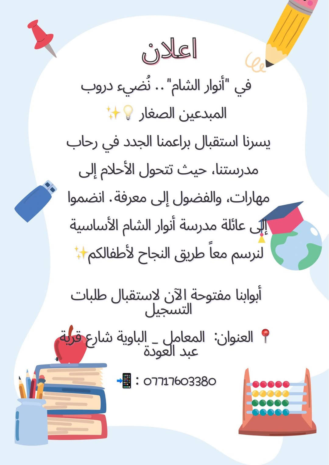 في أنوار الشام الاساسية الاهلية نُضيء دروب المبدعين الصغار 💡✨ أبوابنا مفتوحة الآن لاستقبال طلبات التسجيل مدرسة انوار الشام الأساسية الاهلية 📍 العنوان: المعامل _ الباوية شارع قرية عبد العودة 📲 📲 : ***********