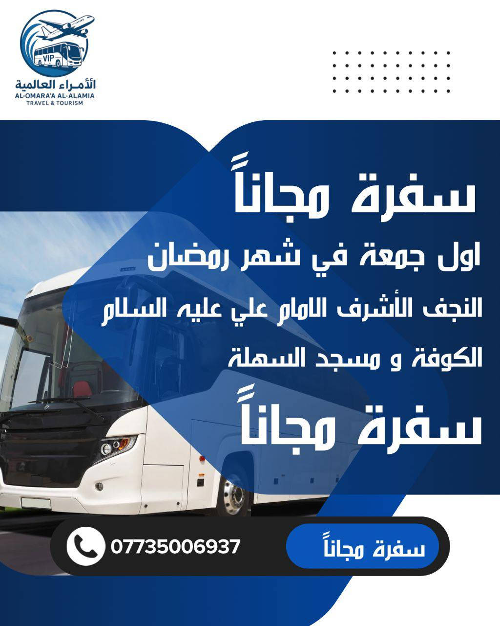 مجانا #مجانا النجف الاشرف تعلن شركة الامراء العالمية وانوار ادم الى نجف الاشرف مجانا 🌹❤️ ———————————- ١-الامام علي ع ٢-الكوفة ٣-مسجد السهلة ——————————- اول جمعه شهر رمضان المبارك مجانا الاهالي كربلاء المقدسه الحجز مقر الشركة التجمع ٣ الضهر ——————————- كربلاء حي تعليب مجاور جامعه السبطين ***********