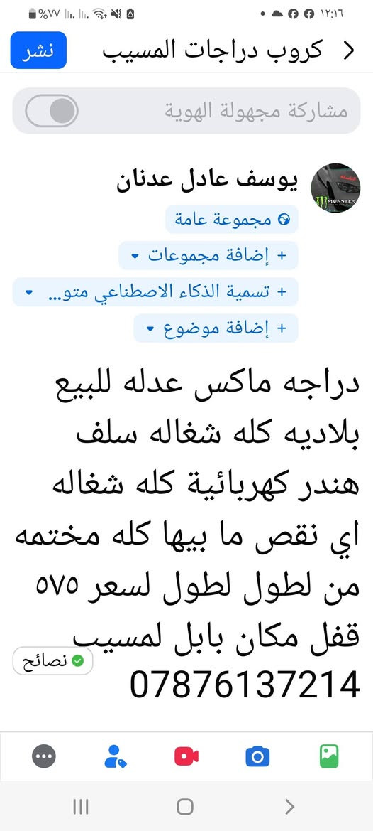 دراجه ماكس عدله للبيع بلاديه كله شغاله سلف هندر كهربائية كله شغاله اي نقص ما بيها كله مختمه من لطول لطول لسعر ٥٧٥ قفل مكان بابل لمسيب ***********