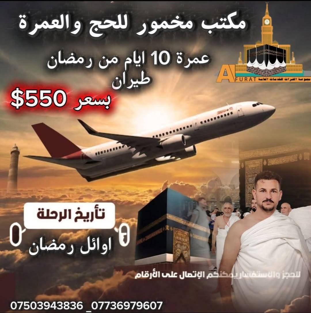 يعلن مكتب مخمور للحج والعمرة عن عروضة المميزة __________________ اوائل شهر رمضان بسعر ناري 🔥 550 $ طيران ✈️ ✈️ __________________&&&& عشرة أواخر 750 $ 🔥 طيران🔥 ✈️ ✈️ _________________________________ عشرة أواخر 700 $ بر 🔥 🔥 🚌 🚌 ________________ لا تفوت الفرصة أيام مبارك سعر بلاش وجبة طعام اثناء الطريق وجبة طعام واحده مع فواكة ان توفرت في مكة المكرمة هدايا للمعتمرين مزارات دينيه وسياحية للمعتمرين بيها اختياريه العنوان قضاء مخمور قرب شعبة زراعة *********** ***********