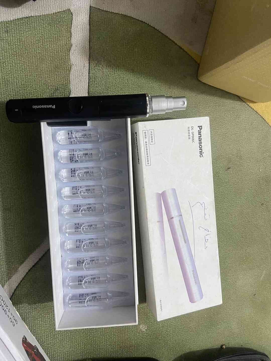 هذا جهاز باناسونيك للوجه، اسمه تقريبًا Panasonic DL-SP006C. 🔹 شنو وظيفته؟ • جهاز نانو/ميزو سبراي يرش سائل على البشرة • يُستخدم مع أمبولات (القناني الزجاجية الصغيرة الظاهرة بالصورة) • يفيد في: • ترطيب البشرة • تفتيح خفيف • نضارة وعلاج آثار تعب الوجه • يُستعمل بالصالونات أو بالبيت 🔹 القناني: هاي أمبولات سيروم خاصة للجهاز، تنحط بالجهاز ويرشها كرذاذ ناعم على الوجه **إذا كنت صاحب هذا الإعلان وتريد حذفه لأي سبب، رجاءا أرسل رسالة إلى الدعم الفني**
