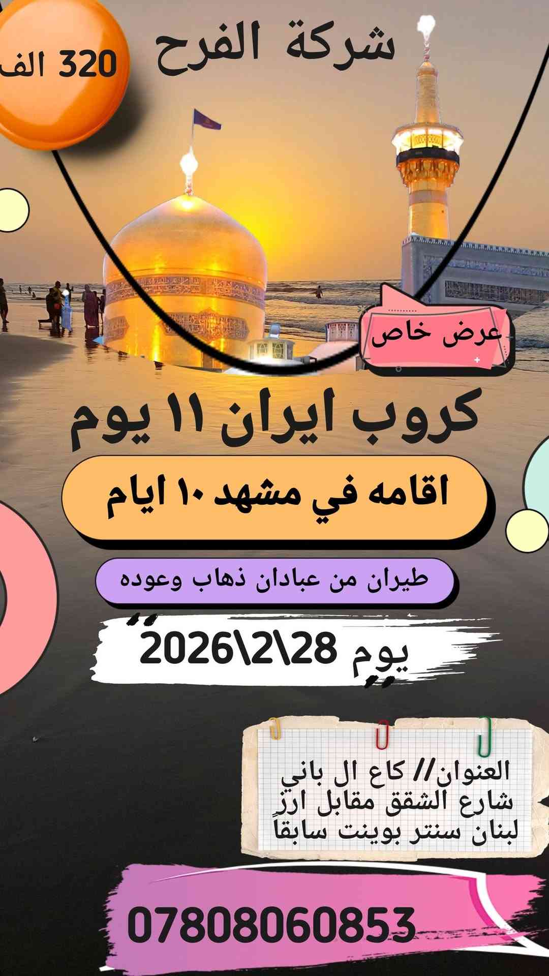 ⚡️شركة الفرح لنقل المسافرين⚡️ #رحلات_قوافل_الزائرين_للحج_والعمره🕋🕋 تقدم لكم ارقى العروض 💁♂️ #كروباتنا_في_شهر_رمضان وكل عام وانتم بالف خير يارب 🤲 انت بس اختار ولا تحتار 🌐 ويانه غير وغير 🥰 #في_شهر_رمضان_المبارك تبدء من يوم 28\2\2026 🌸🌸🌸🌸🌸🌸🌸 #عرض_خاص_عرض_خاص الى متابعينا الافاضل 1️⃣ ايران 11 يوم #320_الف_فقط طيران ذهاب وعوده عن طريق عبادان اقامة في مشهد 10 ايام ومو بس هاي بعد 2 وجبات طعام بمشهد 🥰 الافطار والاسحار 🙆♂️ 🔹️🔹️🔹️🔹️🔹️🔹️🔹️ ✅️البرنامج ايران 11 يوم ☑️طيران من عبادان ذهاب وعوده ☑️10 ايام في مشهد ☑️فنادق درجه اولى قريبه عن الحرم ☑️زيارة ياسر وناصر ☑️زيارة خواجة ابا صلت ☑️جبل كوسنكي 🔹️🔹️🔹️🔹️🔹️🔹️🔹️ البرنامج يشمل: ☑️النقل من الشركة الى الشركة ☑️نقل داخل ايران ☑️طيران ذهاب وعوده ☑️السكن في فنادق قريبة للحرم 🔹️🔹️🔹️🔹️🔹️🔹️🔹️ للاستفار الاتصال #رقم_الشركة *********** #ابو_حمزه *********** او زيارة موقعنا الكائن في كاع ال باني شارع الشقق مقابل ارز لبنان سنتر بوينت سابقا. شركة_الفرح_لنقل_المسافرين🌸