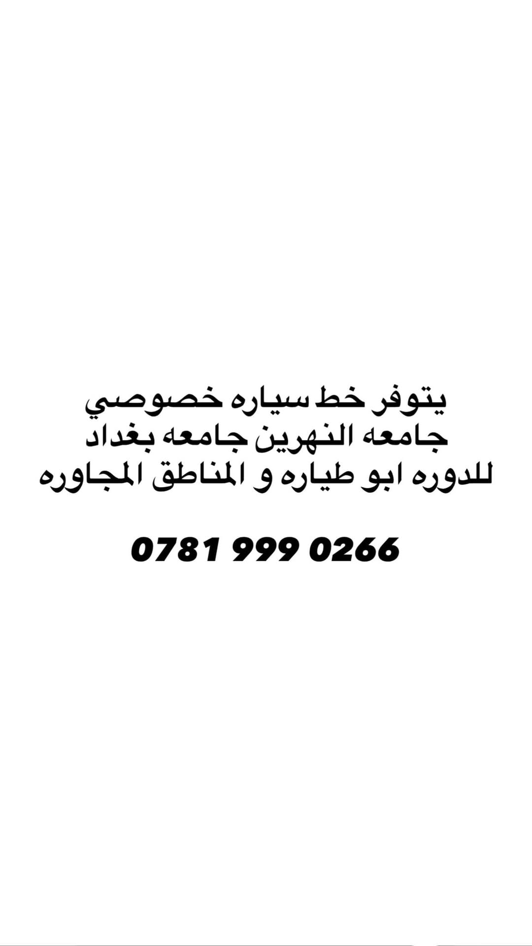يتوفر خط سياره خصوصي سني تحتوي على تبريد جامعه النهرين جامعه بغداد للدوره ابو طياره و المناطق المجاوره 0781 999 0266