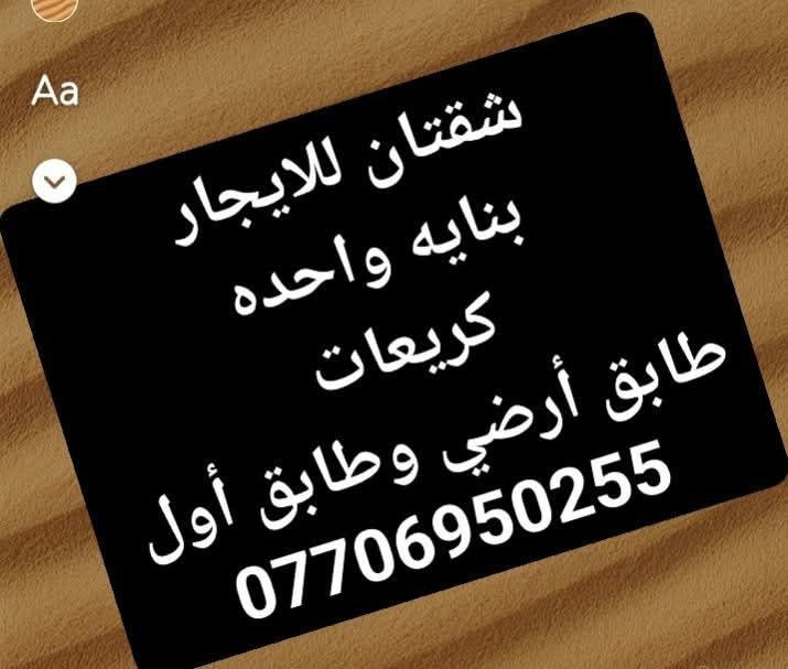🏢 شقتان للإيجار – بناية واحدة 📍 العنوان: كريعات 🔹 الطابق الأرضي الإيجار: 250 ألف 🔹 الطابق الأول الإيجار: 225 ألف 📐 مساحة كل شقة: 50 متر تتكون من: غرفة نوم واحدة 🛏 هول مطبخ حمام وخدمات شقق مرتبة ومناسبة للسكن ✨ للاستفسار الاتصال على الرقم *********** متوفر واتس اب