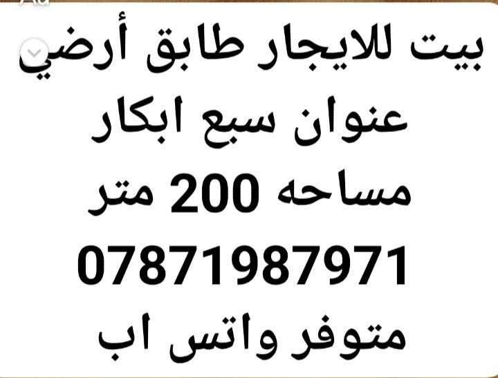 🌟 بيت طابق أرضي للإيجار – سبع أبكار 🌟 🏠 المساحة: 200 متر 💰 الإيجار: 700 ألف (قفل) 📍 العنوان: سبع أبكار – قريب جداً على خط 5 🚗 عرض الشارع: 10 متر ✨ المواصفات: ✔️ كراج للسيارة ✔️ طرمة ثانية واسعة ✔️ غرفتين نوم ✔️ هول ✔️ حولي ✔️ خدمات ✔️ بيت نظيف جداً وصالح للسكن فوراً 👈شرط أن يكون مستاجر حصرا من المنطقه👉 👈 او لديه كفيل ...رجاءا عدم الاحراج 👉 📲 للتواصل (متوفر واتساب): ***********