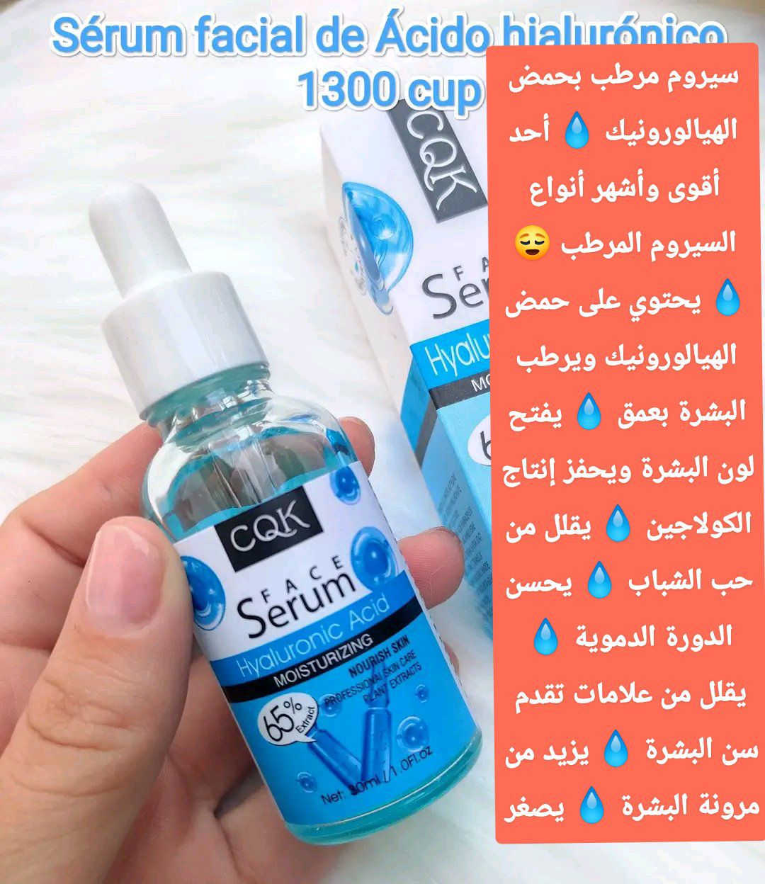 سيروم مرطب بحمض الهيالورونيك 💧 أحد أقوى وأشهر أنواع السيروم المرطب 😌 💧 يحتوي على حمض الهيالورونيك ويرطب البشرة بعمق 💧 يفتح لون البشرة ويحفز إنتاج الكولاجين 💧 يقلل من حب الشباب 💧 يحسن الدورة الدموية 💧 يقلل من علامات تقدم سن البشرة 💧 يزيد من مرونة البشرة 💧 يصغر المسام 💧 يحتوي على خلاصة حمض الهيالورونيك 💧 الحجم: 30 مل **إذا كنت صاحب هذا الإعلان وتريد حذفه لأي سبب، رجاءا أرسل رسالة إلى الدعم الفني**