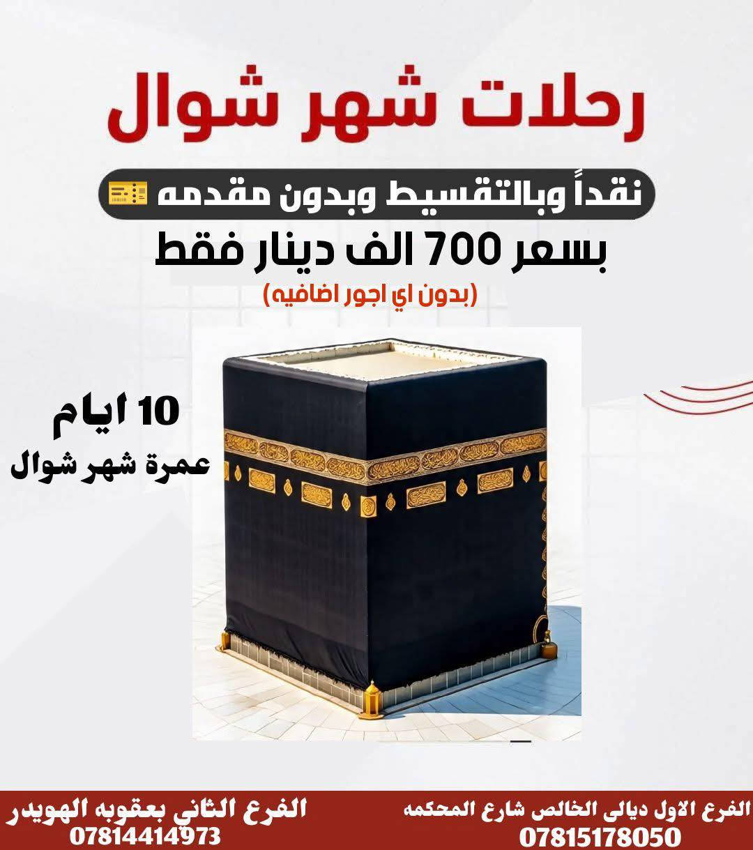 "فرصة لأداء العمرة في شهر شوال! تنظم شركتنا رحلة عمرة إلى مكة المكرمة والمدينة المنورة في شهر شوال، فلا تفوت الفرصة! 🛑🛑 اخر عمرة لهذا الموسم 🛑🛑 بالنقد والتقسيط تاريخ الرحلة: [23/3/2026] احجز الان قبل توقف الفيزا مدة الرحلة: [10 ايام من الطمأنينه والسكينه] السعر: [700 الف دينار فقط] يشمل البرنامج: - ذهاب وعوده باصات حديثه ومكيفه - الإقامة فندق قريب من المسجد النبوي ومكه محبس الجن - وجبات الطعام اختياريه - مرافقة مرشد ديني من الهيئه العليا للحج والعمرة - هدايا حقيبة كتف مع احرامات رجاليه ونسائيه - مزرعه بالطريق مؤثثه للمبيت لراحة المعتمرين - رحلة ترفيهيه الى جده اختياريه للتسجيل جواز السفر مع صور عدد 2 ومبلغ الرحله ♦️الفرع الاول ديالى الخالص شارع المحكمه قرب كراج القرى *********** ♦️الفرع الثاني بعقوبه الهويدر قرب مسبح النخيل *********** سارع بالحجز، العدد محدود! "نسأل الله أن يتقبل منا ومنكم صالح الأعمال"