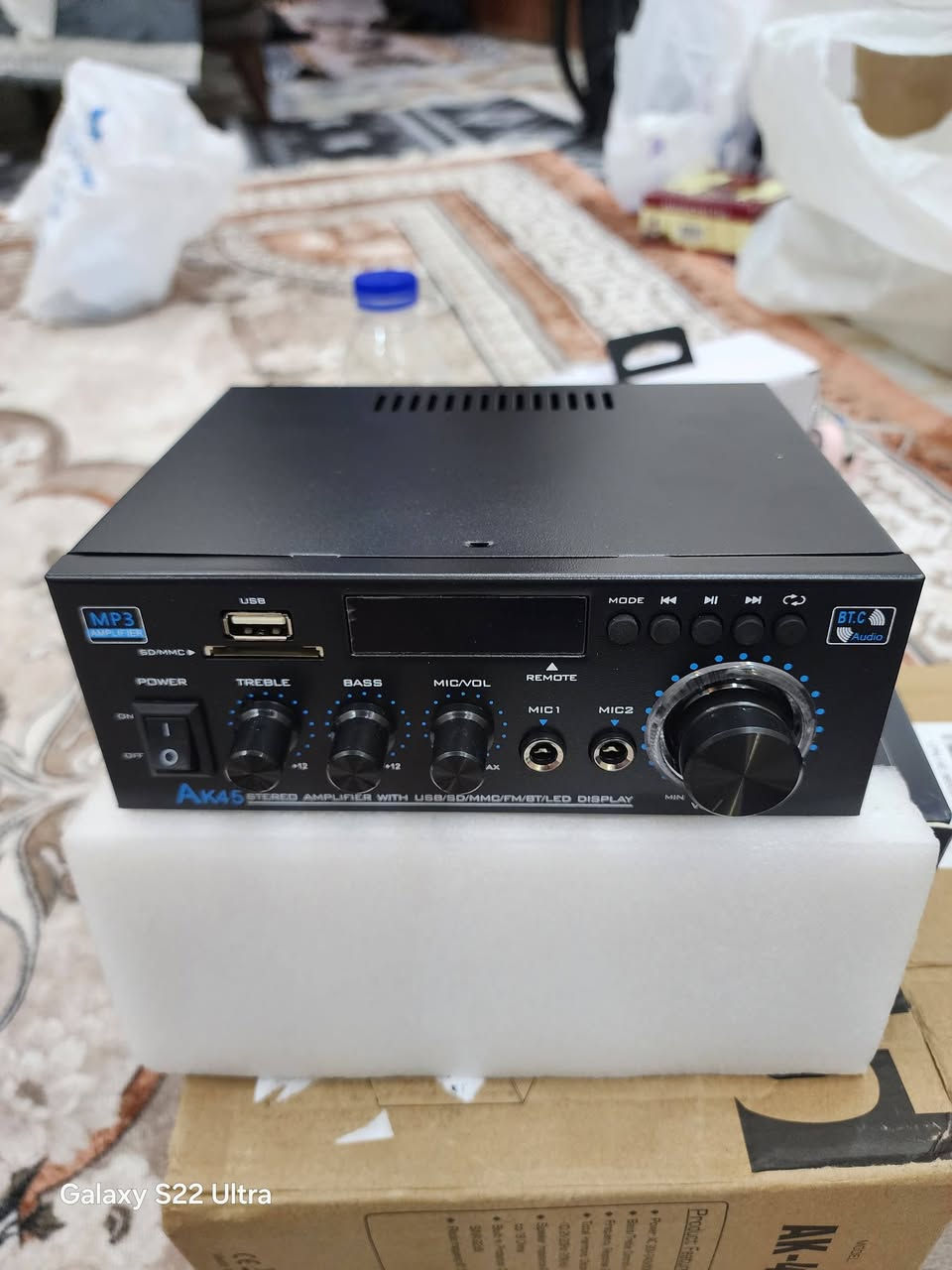 من رخصة الادمن متوفر ب٢٠ ألف المنتج الموضح في الصورة هو مضخم صوت رقمي من نوع AK45، وهو جهاز مصمم للاستخدام المنزلي أو في السيارات لتكبير وتحسين جودة الصوت. يتميز الجهاز بتصميم مدمج ويدعم تقنيات اتصال متعددة لتشغيل الموسيقى بسهولة. المواصفات الأساسية لجهاز AK45: القوة: تصل القوة القصوى للجهاز إلى حوالي 300 واط لكل قناة (بإجمالي 600 واط أو 800 واط حسب الإصدار)، مع قدرة مقدرة (RMS) تبلغ 40 واط + 40 واط. تقنيات الاتصال: يدعم الاتصال اللاسلكي عبر بلوتوث 5.0، بالإضافة إلى مداخل لبطاقات الذاكرة SD، وفلاشات USB، ومدخل صوت AUX. التحكم الصوتي: يحتوي على مقابض أمامية للتحكم في مستوى الصوت العام، ودرجات الجهير (Bass)، والسوبر (Treble). ميزات إضافية: مزود براديو FM، وشاشة عرض LED رقمية، وجهاز تحكم عن بعد (Remote Control)، ومدخلين للميكروفون لاستخدامه في نظام الكاريوكي. محتويات العبوة: يأتي الجهاز عادةً مع: وحدة مضخم الصوت AK45. جهاز تحكم عن بعد. سلك الطاقة (يتوافق مع جهد كهربائي يتراوح بين 90 و240 فولت **إذا كنت صاحب هذا الإعلان وتريد حذفه لأي سبب، رجاءا أرسل رسالة إلى الدعم الفني**