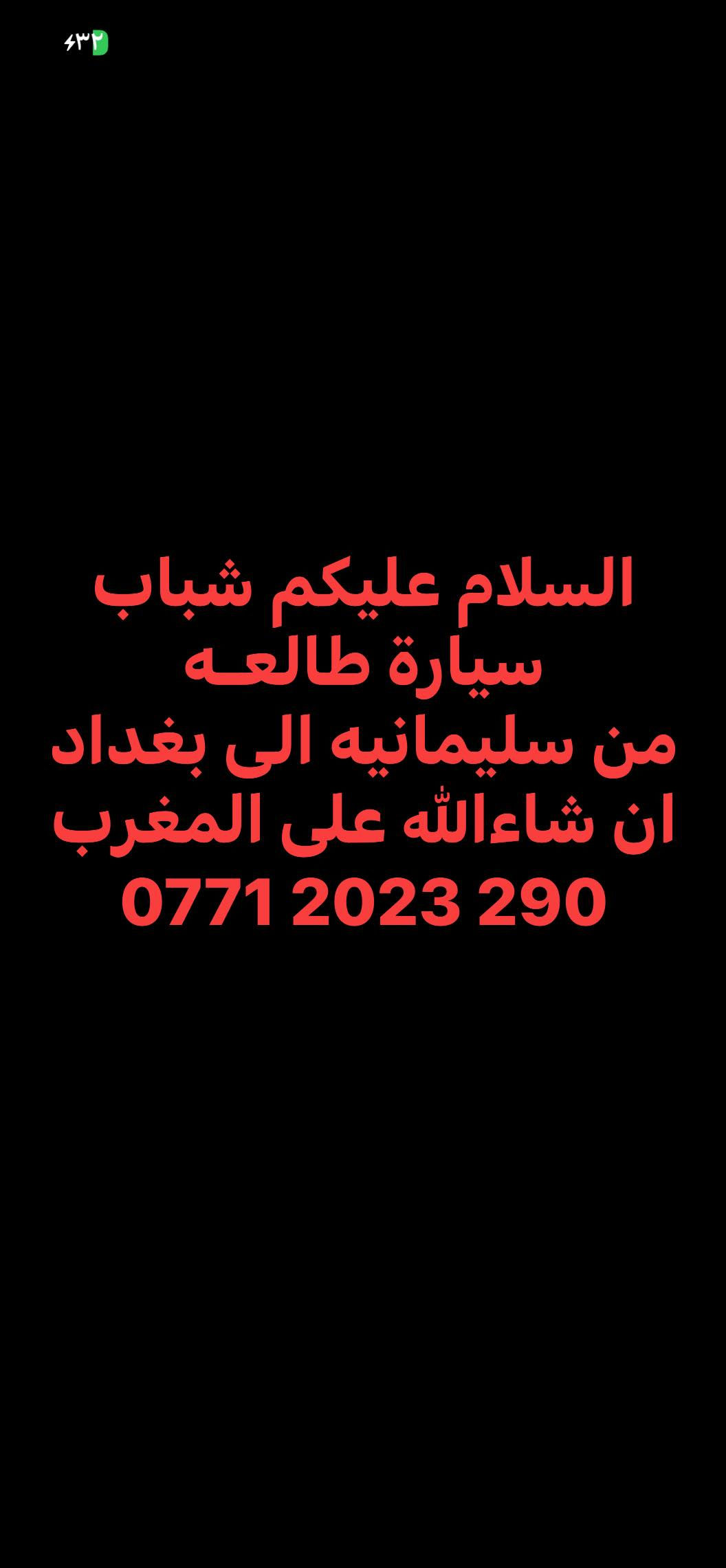 صقور الأرض للنقل و السياحة السلام عليكم شباب سياره حديثة صالون.. طالعة من سليمانيه الى بغداد بأذن لله اليوم..الي عنده امانات..بريد بالخدمة *********** :📞 ملاحظة : النقل حصراً من الباب الى الباب❤️
