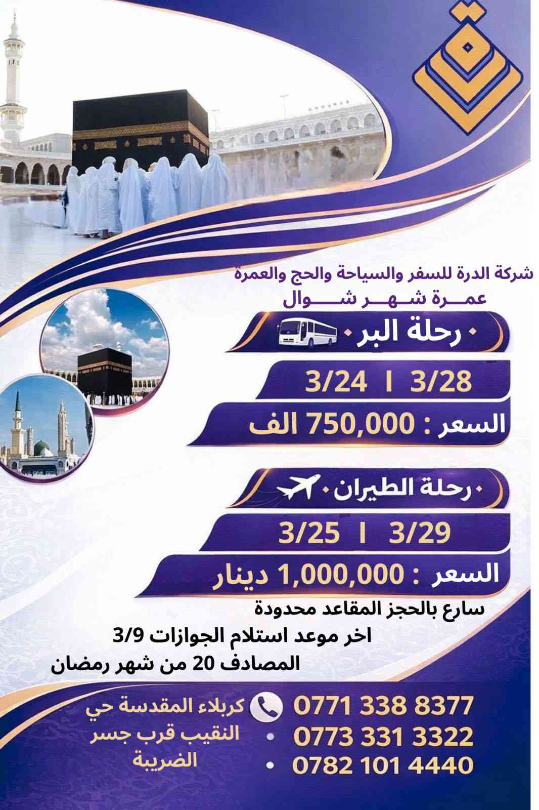 عروض عروض سارع بالحجز المقاعد محدوده جداً عمـــرة شــهـــر شـــــوال🕋🤲 خدمات كاملة وهداياكم علينه #ملاحضه المتعهدين والاعداد الكبيره لهم خصم خاص 🚍 قافلة البر بتاريخ 24/3 28/3 السعر: 750 الف دينار عراقي 🕌 3 ليالٍي في المدينة المنوّرة 🕋 6 ليالٍي في مكة المكرمة ✈️ رحلة الطيران بتاريخ 25/3 29/3 السعر .مليون 1,000,000دينار عراقي 🕌 3 ليالٍي في المدينة 🕋 7 ليالٍي في مكة #ملاحضه اخر موعد استلام الجوازات. 3/9 المصادف. 20 من شهر رمضان يشمل العرض: 🍽 بوفيه 3 وجبات يوميًا 🚌 نقل حديث ومكيّف 🛏 فنادق قريبة ومختارة بعناية 🕋 مزارات وجولات دينية 👥 إشراف ومرافقة مستمرة كادر ارشادي يرافق الرحلة كادر اداري واعلامي محترف 🎁 هدايانا لكل معتمر: 🧣 شفقة رجالية 🧕 شفقة نسائية 🩳 إحرام رجالي 🧳 جنطة كبيرة 🎒 جنطة صغيرة 🪪 باجات تعريفية 🔥 ا… سارعوا بالحجز وعيشوا بركة شوال وكونو اول ضيوف الرحمان 📲 للتسجيل والاستفسار تواصلوا الان كربلاء-حي النقيب- بداية حي النقيب قرب جسر الضريبة 📞 الشركة - *********** 📞خدمة الزبائن _*********** 📞خدمة الزبائن _*********** #عمره #شعبان #عطله #السعودية #العراق