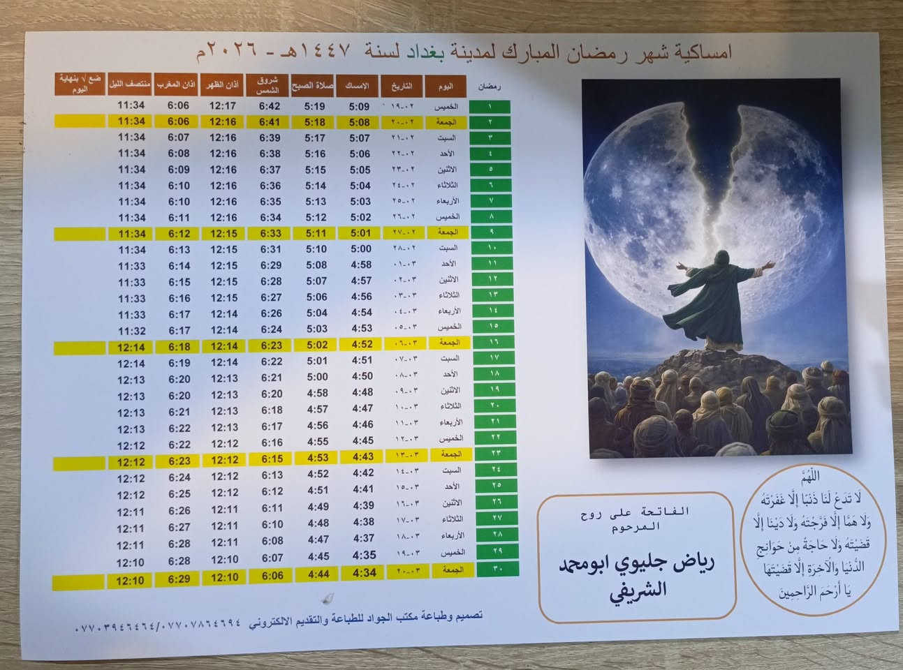 رمضان كريم على الجميع طبع ١٠٠ امساكيه بورق قوي وتصاميم حلوه وانيقه ب٢٠ الف فقط يوجد توصيل للمحافظات العنوان بغداد جميلة الثانية خلف زامل ابو الداطلي بجانب مخبز الروعة ***********