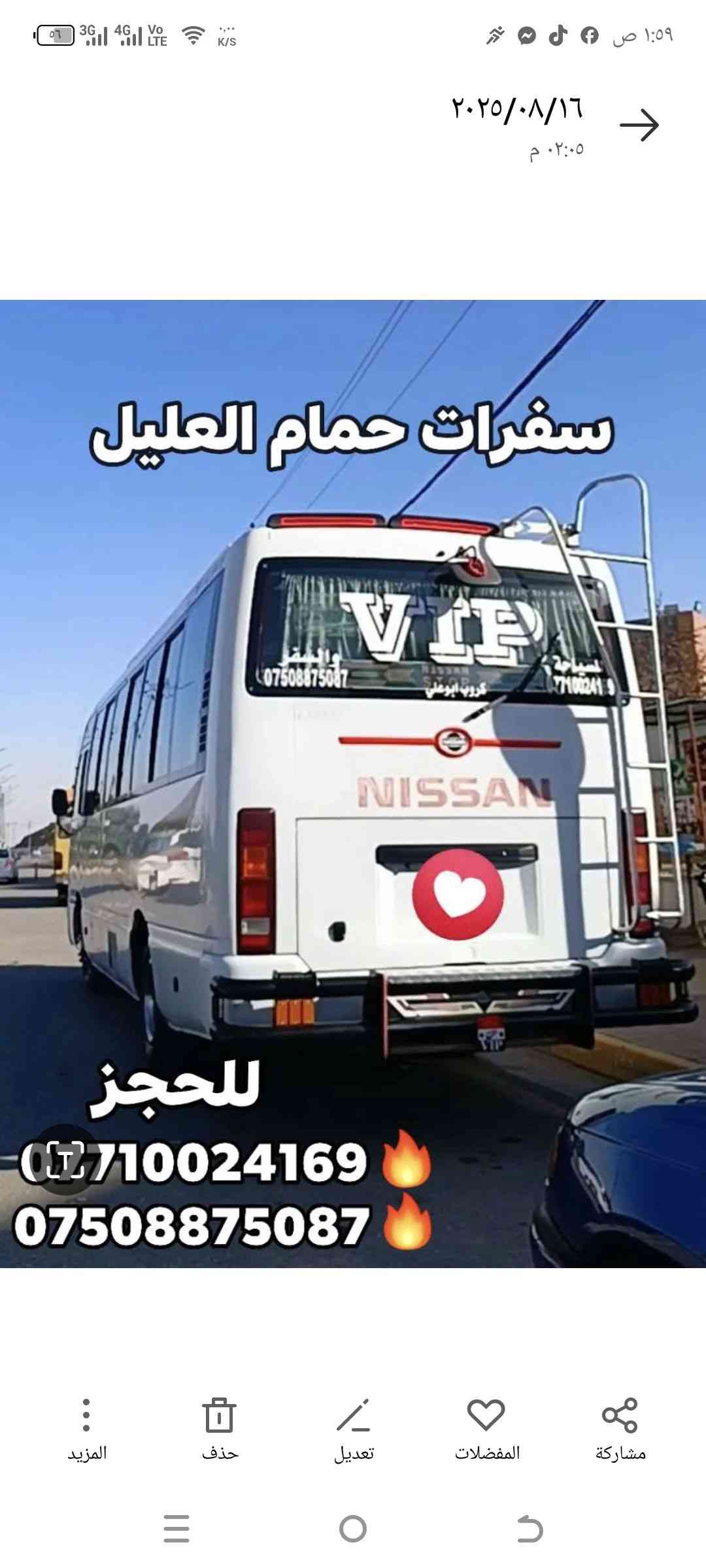 إلى عوائلنا الطيبين 😍 سفرة إلى إلى عوائلنا الطيبين 😍 سفرة إلى حمام العليل 🛀 وبأنسب ال ❤️😍 نتمنى لكم سفرة سعيدة 😍❤️ العليل 🛀 وبأنسب الأسعار عوائل 👨👩👧👦 باص سعر التذكره 4000 الف دينار سياره خصوصي صغيره 20 ألف دينار فقط (روحه ورجعه) 😍 الانطلاق الساعة 1 🕔 ظهرآ ⛱️❤️✨ الـعودة الساعة 6 🕚 مساءاً ⛱️❤️✨ النقل يكون من مناطق العوائل سيارات حديثه تبريد طول الطريق 🚕🚗💥 للاستفسار ولتثبيت الحجوزات 💯 الانطلاق كل أيام الأسبوع 🥰 الاتصال على الارقام التالية *********** واتساب *********** ❤️😍 نتمنى لكم سفرة سعيدة 😍❤️